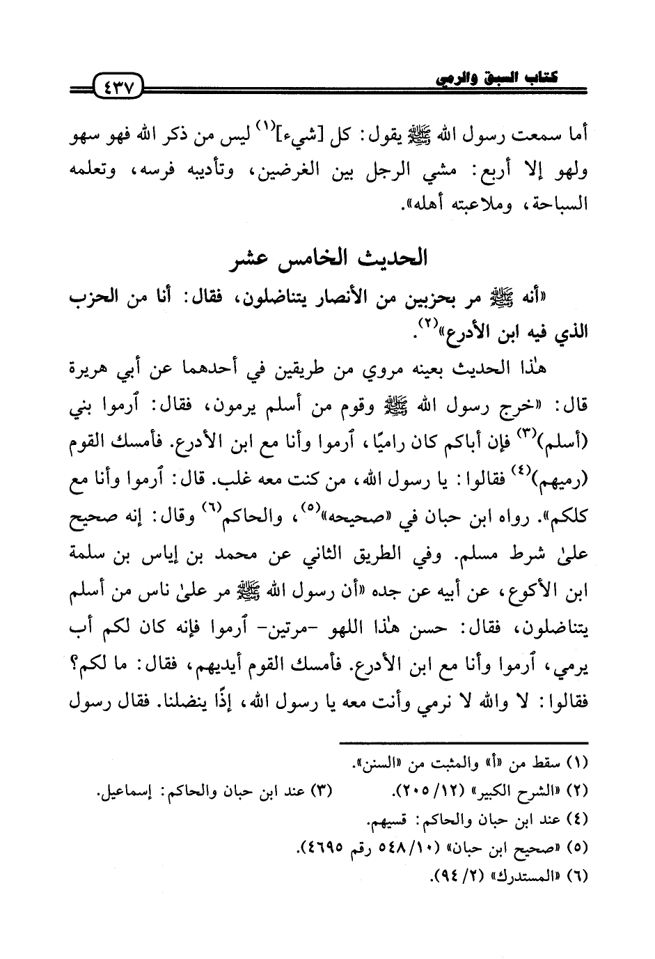 هَذَا الحَدِيث بِعَيْنِه مَرْوِيّ من طَرِيقين فِي أَحدهمَا عَن أبي هُرَيْرَة قَالَ: «خرج رَسُول الله - صَلَّى الله عَلَيْهِ وَسلم - وَقوم من أسلم يرْمونَ، فَقَالَ: ارموا بني (أسلم) فَإِن أَبَاكُم كَانَ راميًا، ارموا وَأَنا مَعَ ابْن الأدرع. فَأمْسك الْقَوْم (رميهم) فَقَالُوا: يَا رَسُول الله، من كنت مَعَه غلب. قَالَ: ارموا وَأَنا مَعَ كلكُمْ» . رَوَاهُ ابْن حبَان فِي «صَحِيحه» ، وَالْحَاكِم وَقَالَ: إِنَّه صَحِيح عَلَى شَرط مُسلم. وَفِي الطَّرِيق الثَّانِي عَن مُحَمَّد بن إِيَاس بن سَلمَة بن الْأَكْوَع، عَن أَبِيه عَن جده «أَن رَسُول الله - صَلَّى الله عَلَيْهِ وَسلم - مر عَلَى نَاس من أسلم يتناضلون، فَقَالَ: حسن هَذَا اللَّهْو - مرَّتَيْنِ - ارموا فَإِنَّهُ كَانَ لكم أَب يَرْمِي، ارموا وَأَنا مَعَ ابْن الأدرع. فَأمْسك الْقَوْم أَيْديهم، فَقَالَ: مَا لكم؟ فَقَالُوا: لَا وَالله لَا نرمي وَأَنت مَعَه يَا رَسُول الله، إِذا ينضلنا. فَقَالَ رَسُول