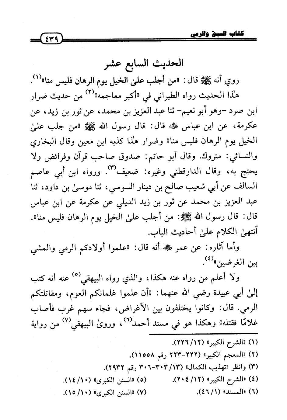 هَذَا الحَدِيث رَوَاهُ الطَّبَرَانِيّ فِي «أكبر معاجمه» من حَدِيث ضرار بن صرد - وَهُوَ أَبُو نعيم - ثَنَا عبد الْعَزِيز بن مُحَمَّد، عَن ثَوْر بن زيد، عَن عِكْرِمَة، عَن ابْن عَبَّاس رَضِيَ اللَّهُ عَنْه قَالَ: قَالَ رَسُول الله - صَلَّى الله عَلَيْهِ وَسلم - «من جلب عَلَى الْخَيل يَوْم الرِّهَان فَلَيْسَ منا» وَضِرَار هَذَا كذبه ابْن معِين وَقَالَ البُخَارِيّ وَالنَّسَائِيّ: مَتْرُوك. وَقَالَ أَبُو حَاتِم: صَدُوق صَاحب قُرْآن وفرائض وَلَا يحْتَج بِهِ، وَقَالَ الدَّارَقُطْنِيّ وَغَيره: ضَعِيف. وَرَوَاهُ ابْن أبي عَاصِم السالف عَن أبي شُعَيْب صَالح بن دِينَار السُّوسِي، ثَنَا مُوسَى بن دَاوُد، ثَنَا عبد الْعَزِيز بن مُحَمَّد عَن ثَوْر بن زيد الديلِي عَن عِكْرِمَة عَن ابْن عَبَّاس قَالَ: قَالَ رَسُول الله - صَلَّى الله عَلَيْهِ وَسلم -: من أجلب عَلَى الْخَيل يَوْم الرِّهَان فَلَيْسَ منا» . انْتَهَى الْكَلَام عَلَى أَحَادِيث الْبَاب.