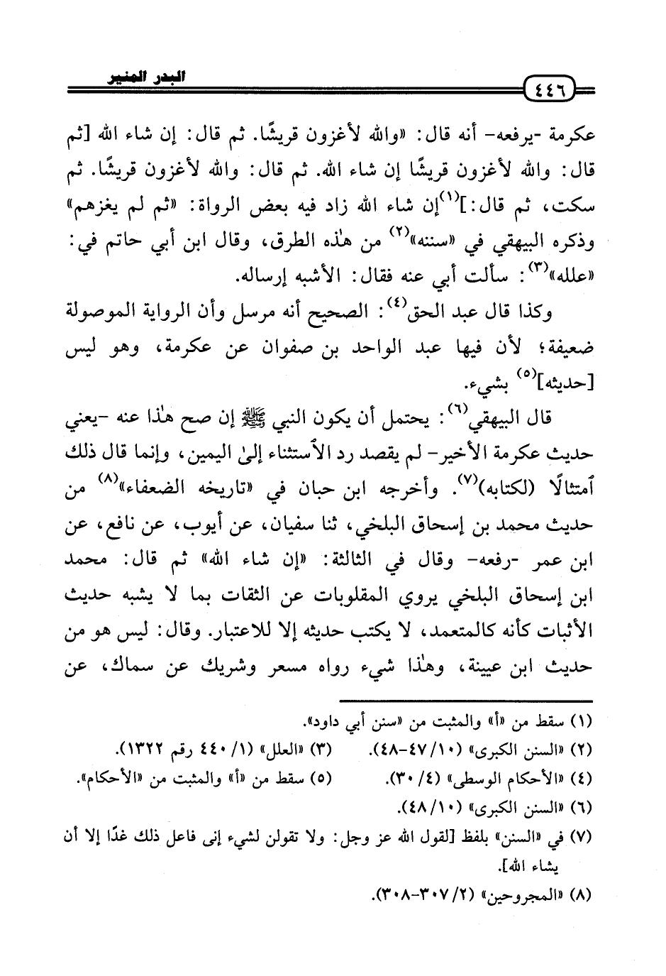 قَالَ الْبَيْهَقِيّ: يحْتَمل أَن يكون النَّبِي - صَلَّى الله عَلَيْهِ وَسلم - إِن صَحَّ هَذَا عَنهُ - يَعْنِي حَدِيث عِكْرِمَة الْأَخير - لم يقْصد رد الِاسْتِثْنَاء إِلَى الْيَمين، وَإِنَّمَا قَالَ ذَلِك امتثالاً (لكتابه) . وَأخرجه ابْن حبَان فِي «تَارِيخه الضُّعَفَاء» من حَدِيث مُحَمَّد بن إِسْحَاق الْبَلْخِي، ثَنَا سُفْيَان، عَن أَيُّوب، عَن نَافِع، عَن ابْن عمر - رَفعه - وَقَالَ فِي الثَّالِثَة: «إِن شَاءَ الله» ثمَّ قَالَ: مُحَمَّد بن إِسْحَاق الْبَلْخِي يروي المقلوبات عَن الثِّقَات بِمَا لَا يشبه حَدِيث الْأَثْبَات كَأَنَّهُ كالمتعمد، لَا يكْتب حَدِيثه إِلَّا للاعتبار. وَقَالَ: لَيْسَ هُوَ من حَدِيث ابْن عُيَيْنَة، وَهَذَا شَيْء رَوَاهُ مسعر وَشريك عَن سماك، عَن