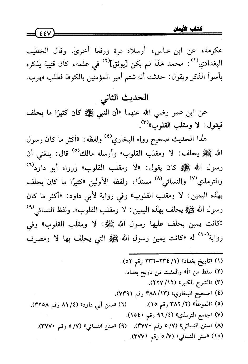 هَذَا الحَدِيث صَحِيح رَوَاهُ البُخَارِيّ وَلَفظه: «أَكثر مَا كَانَ رَسُول الله - صَلَّى الله عَلَيْهِ وَسلم - يحلف: لَا ومقلب الْقُلُوب» وأرسله مَالك قَالَ: بَلغنِي أَن رَسُول الله - صَلَّى الله عَلَيْهِ وَسلم - كَانَ يَقُول: «لَا ومقلب الْقُلُوب» وَرَوَاهُ أَبُو دَاوُد وَالتِّرْمِذِيّ وَالنَّسَائِيّ مُسْندًا، وَلَفظه الْأَوَّلين «كثيرا مَا كَانَ يحلف بِهَذِهِ الْيَمين: لَا ومقلب الْقُلُوب» وَفِي رِوَايَة لأبي دَاوُد: «أَكثر مَا كَانَ رَسُول الله - صَلَّى الله عَلَيْهِ وَسلم - يحلف بِهَذِهِ الْيَمين: لَا ومقلب الْقُلُوب» . وَلَفظ النَّسَائِيّ «كَانَت يَمِين يحلف عَلَيْهَا رَسُول الله - صَلَّى الله عَلَيْهِ وَسلم -: لَا ومقلب الْقُلُوب» وَفِي رِوَايَة لَهُ «كَانَت يَمِين رَسُول الله - صَلَّى الله عَلَيْهِ وَسلم - الَّتِي يحلف بهَا لَا ومصرف