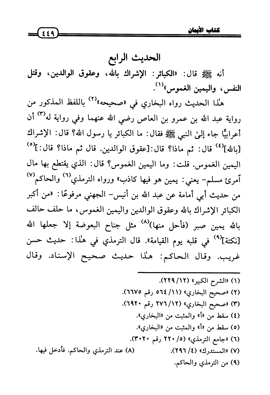 هَذَا الحَدِيث رَوَاهُ البُخَارِيّ فِي «صَحِيحه» بِاللَّفْظِ الْمَذْكُور من رِوَايَة عبد الله بن عَمْرو بن الْعَاصِ رَضِيَ اللَّهُ عَنْهما وَفِي رِوَايَة لَهُ أَن أعرابيًّا جَاءَ إِلَى النَّبِي - صَلَّى الله عَلَيْهِ وَسلم - فَقَالَ: مَا الْكَبَائِر يَا رَسُول الله؟ قَالَ: الْإِشْرَاك [بِاللَّه] قَالَ: ثمَّ مَاذَا؟ قَالَ: [عقوق الْوَالِدين. قَالَ ثمَّ مَاذَا؟ قَالَ:] الْيَمين الْغمُوس. قلت: وَمَا الْيَمين الْغمُوس؟ قَالَ: الَّذِي يقتطع بهَا مَال امْرِئ مُسلم - يَعْنِي: يَمِين هُوَ فِيهَا كَاذِب» وَرَوَاهُ التِّرْمِذِيّ وَالْحَاكِم من حَدِيث أبي أُمَامَة عَن عبد الله بن أنيس - الْجُهَنِيّ مَرْفُوعا: «من أكبر الْكَبَائِر الْإِشْرَاك بِاللَّه وعقوق الْوَالِدين وَالْيَمِين الْغمُوس، مَا حلف حَالف بِاللَّه يَمِين صَبر (فأحل مِنْهَا) مثل جنَاح الْبَعُوضَة إِلَّا جعلهَا الله [نُكْتَة] فِي قلبه يَوْم الْقِيَامَة» . قَالَ التِّرْمِذِيّ فِي هَذَا: حَدِيث حسن غَرِيب. وَقَالَ الْحَاكِم: هَذَا حَدِيث صَحِيح الْإِسْنَاد. وَقَالَ