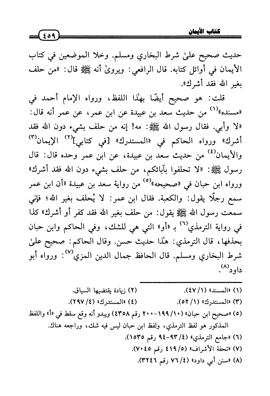 قلت: هُوَ صَحِيح أَيْضا بِهَذَا اللَّفْظ، وَرَوَاهُ الإِمَام أَحْمد فِي «مُسْنده» من حَدِيث سعد بن عُبَيْدَة عَن ابْن عمر، عَن عمر أَنه قَالَ: «لَا وَأبي. فَقَالَ رَسُول الله - صَلَّى الله عَلَيْهِ وَسلم -: مَه! إِنَّه من حلف بِشَيْء دون الله فقد أشرك» وَرَوَاهُ الْحَاكِم فِي «الْمُسْتَدْرك» [فِي كتابي] الْإِيمَان والأيمان من حَدِيث سعد بن عُبَيْدَة، عَن ابْن عمر وَحده قَالَ: قَالَ رَسُول (: «لَا تحلفُوا بِآبَائِكُمْ، من حلف بِشَيْء دون الله فقد أشرك» وَرَوَاهُ ابْن حبَان فِي «صَحِيحه» من رِوَايَة سعد بن عُبَيْدَة «أَن ابْن عمر سمع رجلا يَقُول: والكعبة. فَقَالَ ابْن عمر: لَا يُحلف بِغَيْر الله؛ فَإِنِّي سَمِعت رَسُول الله - صَلَّى الله عَلَيْهِ وَسلم - يَقُول: من حلف بِغَيْر الله فقد كفر أَو أشرك» كَذَا فِي رِوَايَة التِّرْمِذِيّ ب «أَو» الَّتِي هِيَ للشَّكّ، وَفِي الْحَاكِم وَابْن حبَان بحذفها، قَالَ التِّرْمِذِيّ: هَذَا حَدِيث حسن. وَقَالَ الْحَاكِم: صَحِيح عَلَى شَرط البُخَارِيّ وَمُسلم. قَالَ الْحَافِظ جمال الدَّين الْمزي: وَرَوَاهُ أَبُو دَاوُد.