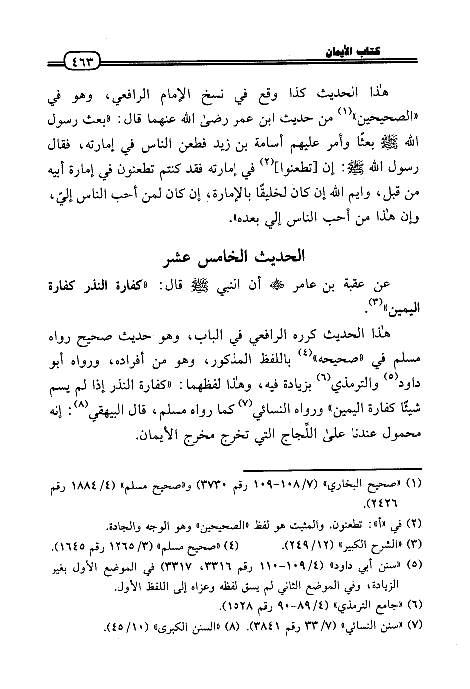 هَذَا الحَدِيث كَذَا وَقع فِي نسخ الإِمَام الرَّافِعِيّ، وَهُوَ فِي «الصَّحِيحَيْنِ» من حَدِيث ابْن عمر رضى الله عَنْهُمَا قَالَ: «بعث رَسُول الله - صَلَّى الله عَلَيْهِ وَسلم - بعثًا وَأمر عَلَيْهِم أُسَامَة بن زيد فطعن النَّاس فِي إمارته، فَقَالَ رَسُول الله - صَلَّى الله عَلَيْهِ وَسلم -: إِن [تطعنوا] فِي إمارته فقد كُنْتُم تطعنون فِي إِمَارَة أَبِيه من قبل، وَايْم الله إِن كَانَ لخليقًا بالإمارة، إِن كَانَ لمن أحب النَّاس إليّ، وَإِن هَذَا من أحب النَّاس إِلَيّ بعده» .