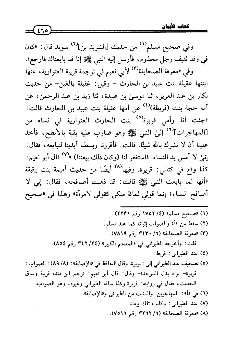 وَفِي «معرفَة الصَّحَابَة» لأبي نعيم فِي تَرْجَمَة قريبَة العتوارية، عَنْهَا ابْنَتهَا عقيلة بنت عبيد بن الْحَارِث - وَقيل: غقيلة بالغين - من حَدِيث بكار بن عبد الْعَزِيز، ثَنَا مُوسَى بن عُبَيْدَة، ثَنَا زيد بن عبد الرَّحْمَن، عَن أمه حجَّة بنت (قُرَيْظَة) عَن أمهَا عقيلة بنت عبيد بن الْحَارِث قَالَت: «جِئْت أَنا وَأمي قريرة بنت الْحَارِث العتوارية فِي نسَاء من [الْمُهَاجِرَات] إِلَى النَّبِي - صَلَّى الله عَلَيْهِ وَسلم - وَهُوَ ضَارب عَلَيْهِ بقبة بِالْأَبْطح، فَأخذ علينا أَن لَا نشْرك بِاللَّه شَيْئا. قَالَت: فأقررنا وبسطنا أَيْدِينَا لنبايعه، فَقَالَ: إنى لَا أمس يَد النِّسَاء. فَاسْتَغْفر لنا (وَكَانَ ذَلِك بيعتنا» ) قَالَ أَبُو نعيم: كَذَا وَقع فِي كتابي: قريرة. وفيهَا أَيْضا من حَدِيث أُمَيْمَة بنت رقيقَة «أَنَّهَا لما بَايَعت النَّبِي - صَلَّى الله عَلَيْهِ وَسلم - قَالَت: قد ذهبت أصافحه، فَقَالَ: إِنِّي لَا أُصَافح النِّسَاء؛ إِنَّمَا قولي لمِائَة مِنْكُن كَقَوْلي لامْرَأَة» وَهَذَا فِي «صَحِيح