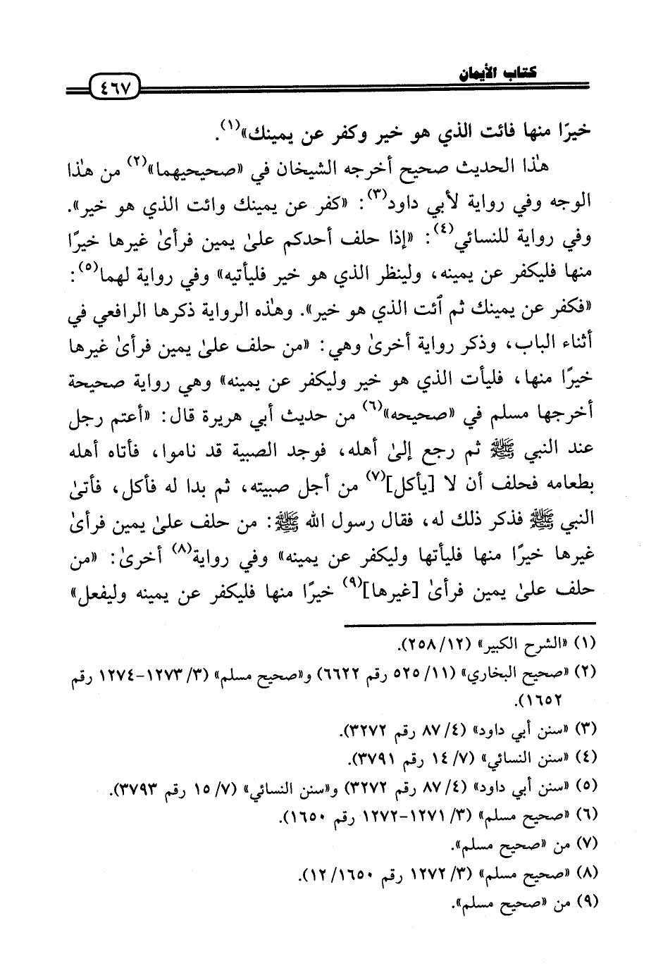 هَذَا الحَدِيث صَحِيح أخرجه الشَّيْخَانِ فِي «صَحِيحَيْهِمَا» من هَذَا الْوَجْه وَفِي رِوَايَة لأبي دَاوُد: «كفر عَن يَمِينك وائت الَّذِي هُوَ خير» . وَفِي رِوَايَة للنسائي: «إِذا حلف أحدكُم عَلَى يَمِين فَرَأَى غَيرهَا خيرا مِنْهَا فليكفر عَن يَمِينه، ولينظر الَّذِي هُوَ خير فليأتيه» وَفِي رِوَايَة لَهما: «فَكفر عَن يَمِينك ثمَّ ائْتِ الَّذِي هُوَ خير» . وَهَذِه الرِّوَايَة ذكرهَا الرَّافِعِيّ فِي أثْنَاء الْبَاب، وَذكر رِوَايَة أُخْرَى وَهِي: «من حلف عَلَى يَمِين فَرَأَى غَيرهَا خيرا مِنْهَا، فليأت الَّذِي هُوَ خير وليكفر عَن يَمِينه» وَهِي رِوَايَة صَحِيحَة أخرجهَا مُسلم فِي «صَحِيحه» من حَدِيث أبي هُرَيْرَة قَالَ: «أعتم رجل عِنْد النَّبِي - صَلَّى الله عَلَيْهِ وَسلم - ثمَّ رَجَعَ إِلَى أَهله، فَوجدَ الصبية قد نَامُوا، فَأَتَاهُ أَهله بطعامه فَحلف أَن لَا [يَأْكُل] من أجل صبيته، ثمَّ بدا لَهُ فَأكل، فَأَتَى النَّبِي - صَلَّى الله عَلَيْهِ وَسلم - فَذكر ذَلِك لَهُ، فَقَالَ رَسُول الله - صَلَّى الله عَلَيْهِ وَسلم -: من حلف عَلَى يَمِين فَرَأَى غَيرهَا خيرا مِنْهَا فليأتها وليكفر عَن يَمِينه» وَفِي رِوَايَة أُخْرَى: «من حلف عَلَى يَمِين فَرَأَى [غَيرهَا] خيرا مِنْهَا فليكفر عَن يَمِينه وليفعل»