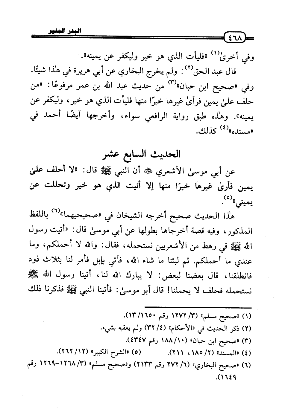 قَالَ عبد الْحق: وَلم يخرج البُخَارِيّ عَن أبي هُرَيْرَة فِي هَذَا شَيْئا. وَفِي «صَحِيح ابْن حبَان» من حَدِيث عبد الله بن عمر مَرْفُوعا: «من حلف عَلَى يَمِين فَرَأَى غَيرهَا خيرا مِنْهَا فليأت الَّذِي هُوَ خير، وليكفر عَن يَمِينه» . وَهَذِه طبق رِوَايَة الرَّافِعِيّ سَوَاء، وأخرجها أَيْضا أَحْمد فِي «مُسْنده» كَذَلِك.