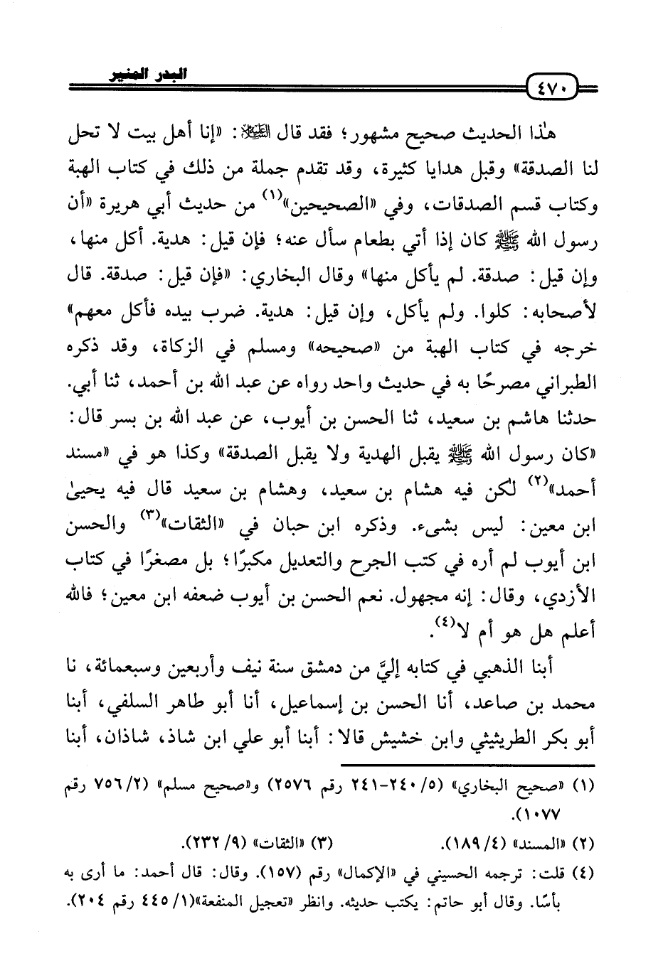 هَذَا الحَدِيث صَحِيح مَشْهُور؛ فقد قَالَ عَلَيْهِ السَّلَام: «إِنَّا أهل بَيت لَا تحل لنا الصَّدَقَة» وَقبل هَدَايَا كَثِيرَة، وَقد تقدم جملَة من ذَلِك فِي كتاب الْهِبَة وَكتاب قسم الصَّدقَات، وَفِي «الصَّحِيحَيْنِ» من حَدِيث أبي هُرَيْرَة «أَن رَسُول الله - صَلَّى الله عَلَيْهِ وَسلم - كَانَ إِذا أُتِي بِطَعَام سَأَلَ عَنهُ؛ فَإِن قيل: هَدِيَّة. أكل مِنْهَا، وَإِن قيل: صَدَقَة. لم يَأْكُل مِنْهَا» وَقَالَ البُخَارِيّ: «فَإِن قيل: صَدَقَة. قَالَ لأَصْحَابه: كلوا. وَلم يَأْكُل، وَإِن قيل: هَدِيَّة. ضرب بِيَدِهِ فَأكل مَعَهم» خرجه فِي كتاب الْهِبَة من «صَحِيحه» وَمُسلم فِي الزَّكَاة، وَقد ذكره الطَّبَرَانِيّ مُصَرحًا بِهِ فِي حَدِيث وَاحِد رَوَاهُ عَن عبد الله بن أَحْمد، ثَنَا أبي. حَدثنَا هَاشم بن سعيد، ثَنَا الْحسن بن أَيُّوب، عَن عبد الله بن بسر قَالَ: «كَانَ رَسُول الله - صَلَّى الله عَلَيْهِ وَسلم - يقبل الْهَدِيَّة وَلَا يقبل الصَّدَقَة» وَكَذَا هُوَ فِي «مُسْند أَحْمد» لَكِن فِيهِ هِشَام بن سعيد، وَهِشَام بن سعيد قَالَ فِيهِ يَحْيَى بن معِين: لَيْسَ بشىء. وَذكره ابْن حبَان فِي «الثِّقَات» وَالْحسن بن أَيُّوب لم أره فِي كتب الْجرْح وَالتَّعْدِيل مكبرًا؛ بل مُصَغرًا فِي كتاب الْأَزْدِيّ، وَقَالَ: إِنَّه مَجْهُول. نعم الْحسن بن أَيُّوب ضعفه ابْن معِين؛ فَالله أعلم هَل هُوَ أم لَا.