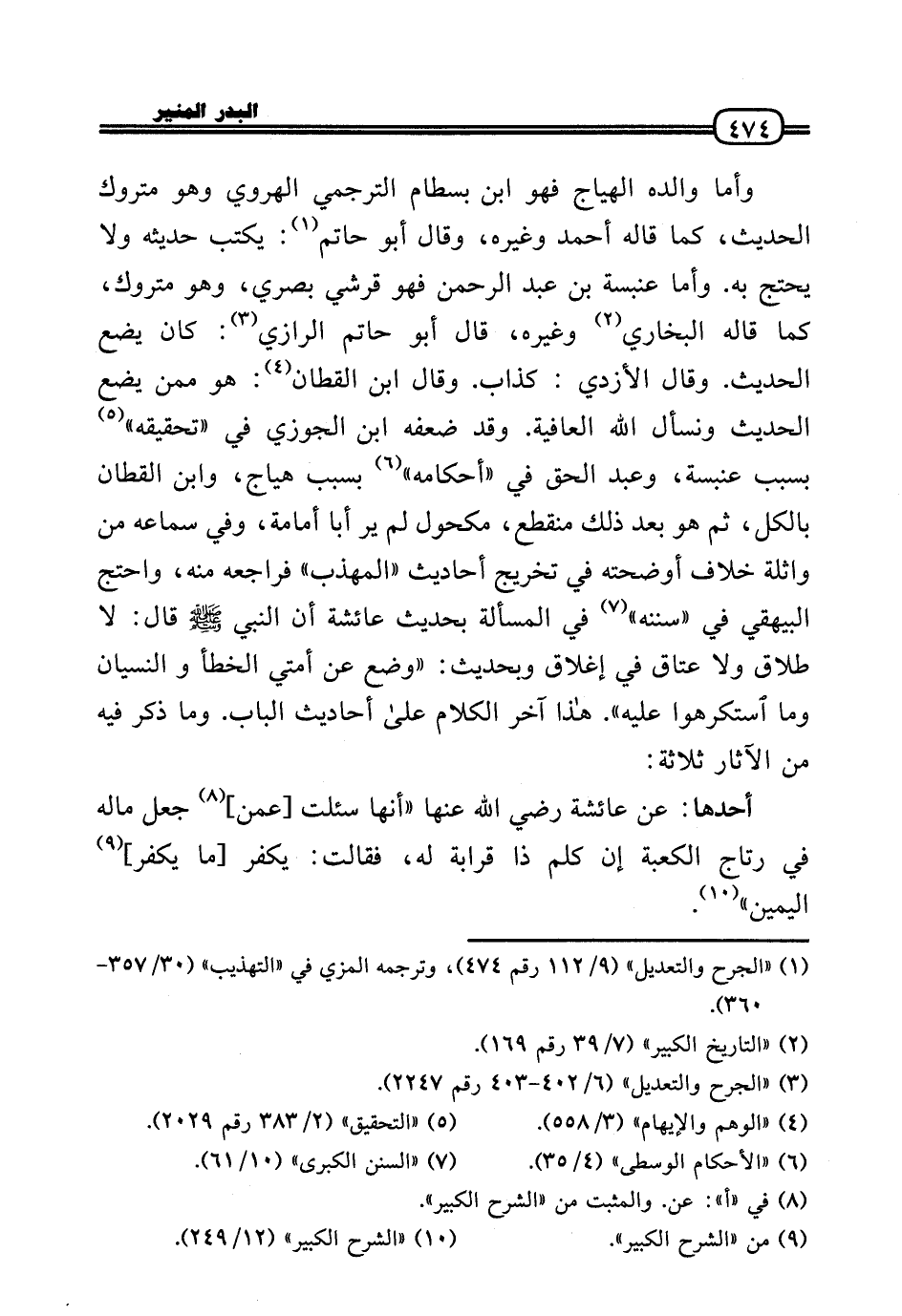 وَأما وَالِده الْهياج فَهُوَ ابْن بسطَام الترجمي الْهَرَوِيّ وَهُوَ مَتْرُوك الحَدِيث، كَمَا قَالَه أَحْمد وَغَيره، وَقَالَ أَبُو حَاتِم: يكْتب حَدِيثه وَلَا يحْتَج بِهِ. وَأما عَنْبَسَة بن عبد الرَّحْمَن فَهُوَ قرشي بَصرِي، وَهُوَ مَتْرُوك، كَمَا قَالَه البُخَارِيّ وَغَيره، قَالَ أَبُو حَاتِم الرَّازِيّ: كَانَ يضع الحَدِيث. وَقَالَ الْأَزْدِيّ: كَذَّاب. وَقَالَ ابْن الْقطَّان: هُوَ مِمَّن يضع الحَدِيث ونسأل الله الْعَافِيَة. وَقد ضعفه ابْن الْجَوْزِيّ فِي «تَحْقِيقه» بِسَبَب عَنْبَسَة، وَعبد الْحق فِي «أَحْكَامه» بِسَبَب هياج، وَابْن الْقطَّان بِالْكُلِّ، ثمَّ هُوَ بعد ذَلِك مُنْقَطع، مَكْحُول لم ير أَبَا أُمَامَة، وَفِي سَمَاعه من وَاثِلَة خلاف أوضحته فِي تَخْرِيج أَحَادِيث «الْمُهَذّب» فَرَاجعه مِنْهُ، وَاحْتج الْبَيْهَقِيّ فِي «سنَنه» فِي الْمَسْأَلَة بِحَدِيث عَائِشَة أَن النَّبِي - صَلَّى الله عَلَيْهِ وَسلم - قَالَ: لَا طَلَاق وَلَا عتاق فِي إغلاق وَبِحَدِيث: «وضع عَن أمتِي الْخَطَأ والنسْيَان وَمَا اسْتكْرهُوا عَلَيْهِ» . هَذَا آخر الْكَلَام عَلَى أَحَادِيث الْبَاب. وَمَا ذكر فِيهِ من الْآثَار ثَلَاثَة: