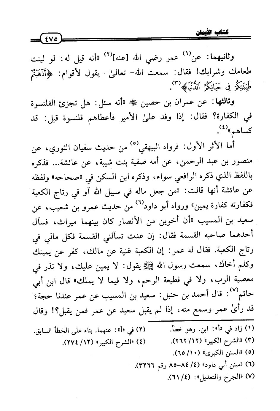 أما الْأَثر الأول: فَرَوَاهُ الْبَيْهَقِيّ من حَدِيث سُفْيَان الثَّوْريّ، عَن مَنْصُور بن عبد الرَّحْمَن، عَن أمه صَفِيَّة بنت شيبَة، عَن عَائِشَة ... فَذكره بِاللَّفْظِ الَّذِي ذكره الرَّافِعِيّ سَوَاء، وَذكره ابْن السكن فِي «صحاحه» وَلَفظه عَن عَائِشَة أَنَّهَا قَالَت: «من جعل مَاله فِي سَبِيل الله أَو فِي رتاج الْكَعْبَة فكفارته كَفَّارَة يَمِين» وَرَوَاهُ أَبُو دَاوُد من حَدِيث عَمْرو بن شُعَيْب، عَن سعيد بن الْمسيب «أَن أَخَوَيْنِ من الْأَنْصَار كَانَ بَينهمَا مِيرَاث، فَسَأَلَ أَحدهمَا صَاحبه الْقِسْمَة فَقَالَ: إِن عدت تَسْأَلنِي الْقِسْمَة فَكل مَالِي فِي رتاج الْكَعْبَة. فَقَالَ لَهُ عمر: إِن الْكَعْبَة غنية عَن مَالك، كفر عَن يَمِينك وكلم أَخَاك، سَمِعت رَسُول الله - صَلَّى الله عَلَيْهِ وَسلم - يَقُول: لَا يَمِين عَلَيْك، وَلَا نذر فِي مَعْصِيّة الرب، وَلَا فِي قطيعة الرَّحِم، وَلَا فِيمَا لَا يملك» قَالَ ابْن أبي حَاتِم: قَالَ أَحْمد بن حَنْبَل: سعيد بن الْمسيب عَن عمر عندنَا حجَّة؛ قد رَأَى عمر وَسمع مِنْهُ، إِذا لم يقبل سعيد عَن عمر فَمن يقبل؟ ! وَقَالَ