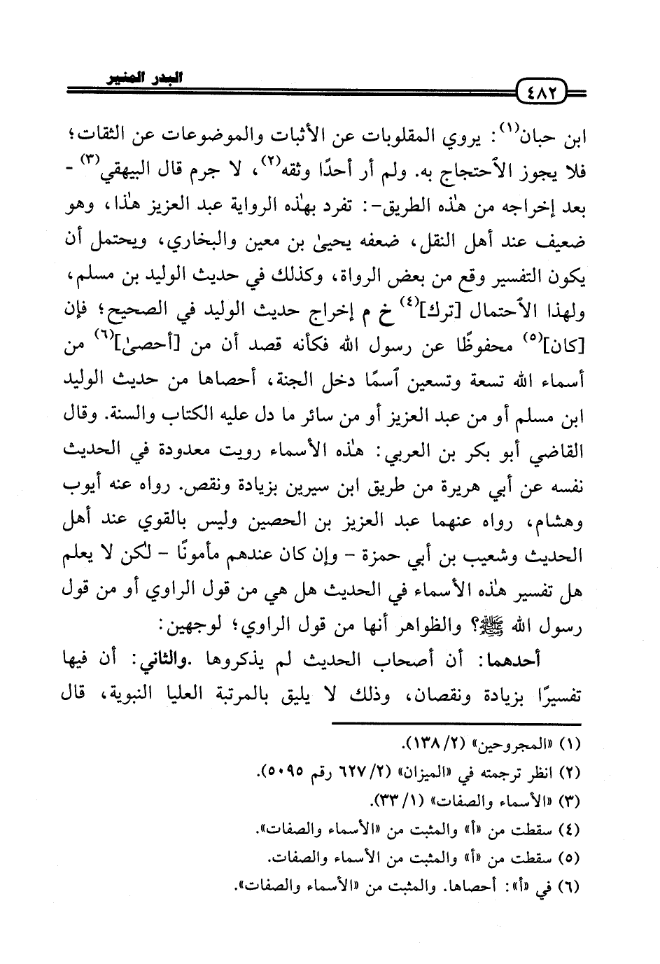 ابْن حبَان: يروي المقلوبات عَن الْأَثْبَات والموضوعات عَن الثِّقَات؛ فَلَا يجوز الِاحْتِجَاج بِهِ. وَلم أر أحدا وَثَّقَهُ، لَا جرم قَالَ الْبَيْهَقِيّ - بعد إِخْرَاجه من هَذِه الطَّرِيق -: تفرد بِهَذِهِ الرِّوَايَة عبد الْعَزِيز هَذَا، وَهُوَ ضَعِيف عِنْد أهل النَّقْل، ضعفه يَحْيَى بن معِين وَالْبُخَارِيّ، وَيحْتَمل أَن يكون التَّفْسِير وَقع من بعض الروَاة، وَكَذَلِكَ فِي حَدِيث الْوَلِيد بن مُسلم، وَلِهَذَا الِاحْتِمَال [ترك] خَ م إِخْرَاج حَدِيث الْوَلِيد فِي الصَّحِيح؛ فَإِن [كَانَ] مَحْفُوظًا عَن رَسُول الله فَكَأَنَّهُ قصد أَن من [أحصى] من أَسمَاء الله تِسْعَة وَتِسْعين اسْما دخل الْجنَّة، أحصاها من حَدِيث الْوَلِيد بن مُسلم أَو من عبد الْعَزِيز أَو من سَائِر مَا دلّ عَلَيْهِ الْكتاب وَالسّنة. وَقَالَ القَاضِي أَبُو بكر بن الْعَرَبِيّ: هَذِه الْأَسْمَاء رويت مَعْدُودَة فِي الحَدِيث نَفسه عَن أبي هُرَيْرَة من طَرِيق ابْن سِيرِين بِزِيَادَة وَنقص. رَوَاهُ عَنهُ أَيُّوب وَهِشَام، رَوَاهُ عَنْهُمَا عبد الْعَزِيز بن الْحصين وَلَيْسَ بِالْقَوِيّ عِنْد أهل الحَدِيث وَشُعَيْب بن أبي حَمْزَة - وَإِن كَانَ عِنْدهم مَأْمُونا - لَكِن لَا يعلم هَل تَفْسِير هَذِه الْأَسْمَاء فِي الحَدِيث هَل هِيَ من قَول الرَّاوِي أَو من قَول رَسُول الله - صَلَّى الله عَلَيْهِ وَسلم -؟ والظواهر أَنَّهَا من قَول الرَّاوِي؛ لوَجْهَيْنِ: