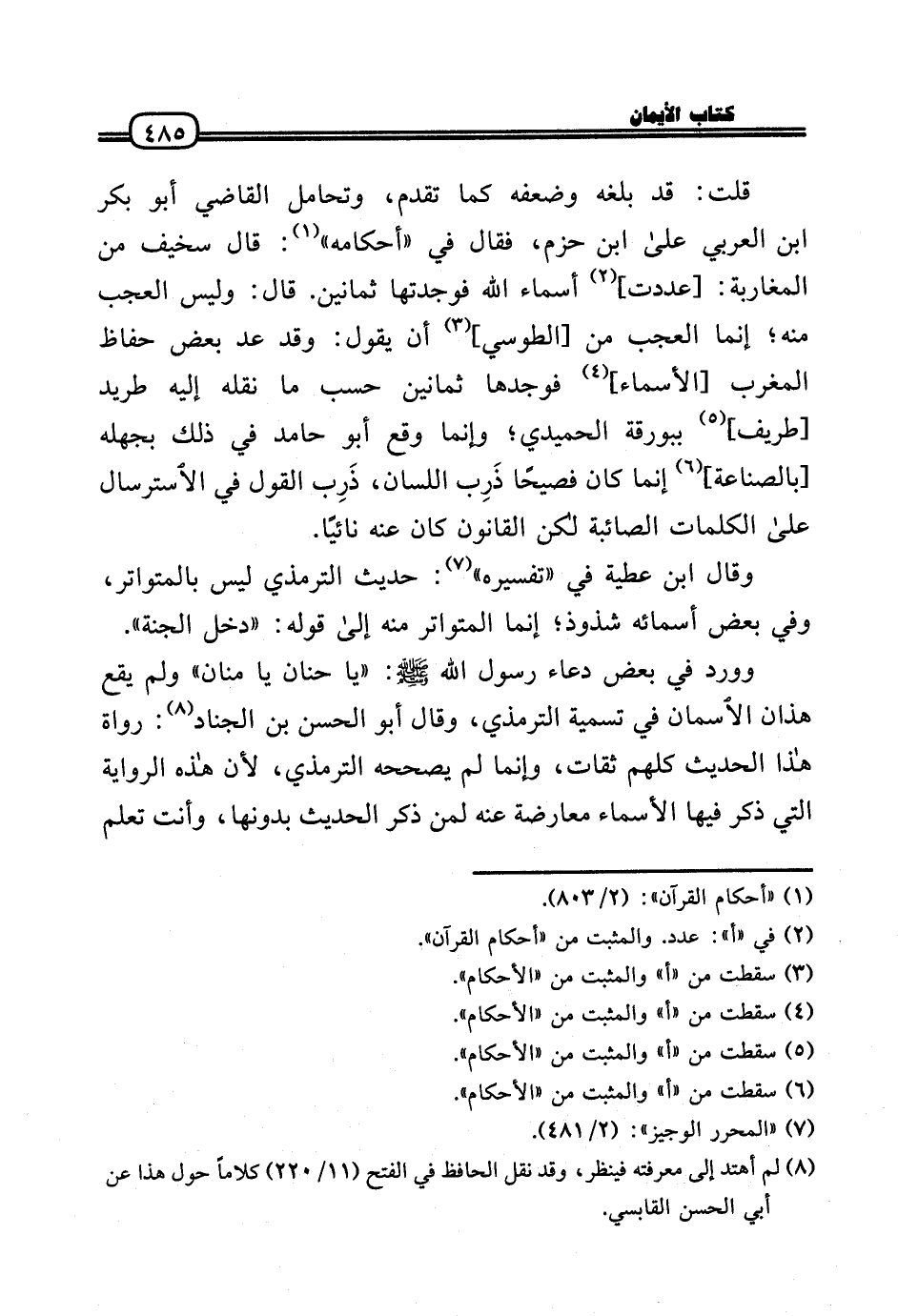 قلت: قد بلغه وَضَعفه كَمَا تقدم، وتحامل القَاضِي أَبُو بكر بن الْعَرَبِيّ عَلَى ابْن حزم، فَقَالَ فِي «أَحْكَامه» : قَالَ سخيف من المغاربة: [عددت] أَسمَاء الله فَوَجَدتهَا ثَمَانِينَ. قَالَ: وَلَيْسَ الْعجب مِنْهُ؛ إِنَّمَا الْعجب من [الطوسي] أَن يَقُول: وَقد عد بعض حفاظ الْمغرب [الْأَسْمَاء] فَوَجَدَهَا ثَمَانِينَ حسب مَا نَقله إِلَيْهِ طريد [طريف] ببورقة الْحميدِي؛ وَإِنَّمَا وَقع أَبُو حَامِد فِي ذَلِك بجهله [بالصناعة] إِنَّمَا كَانَ فصيحًا ذَرِب اللِّسَان، ذَرِب القَوْل فِي الاسترسال عَلَى الْكَلِمَات الصائبة لَكِن القانون كَانَ عَنهُ نَائِيا.