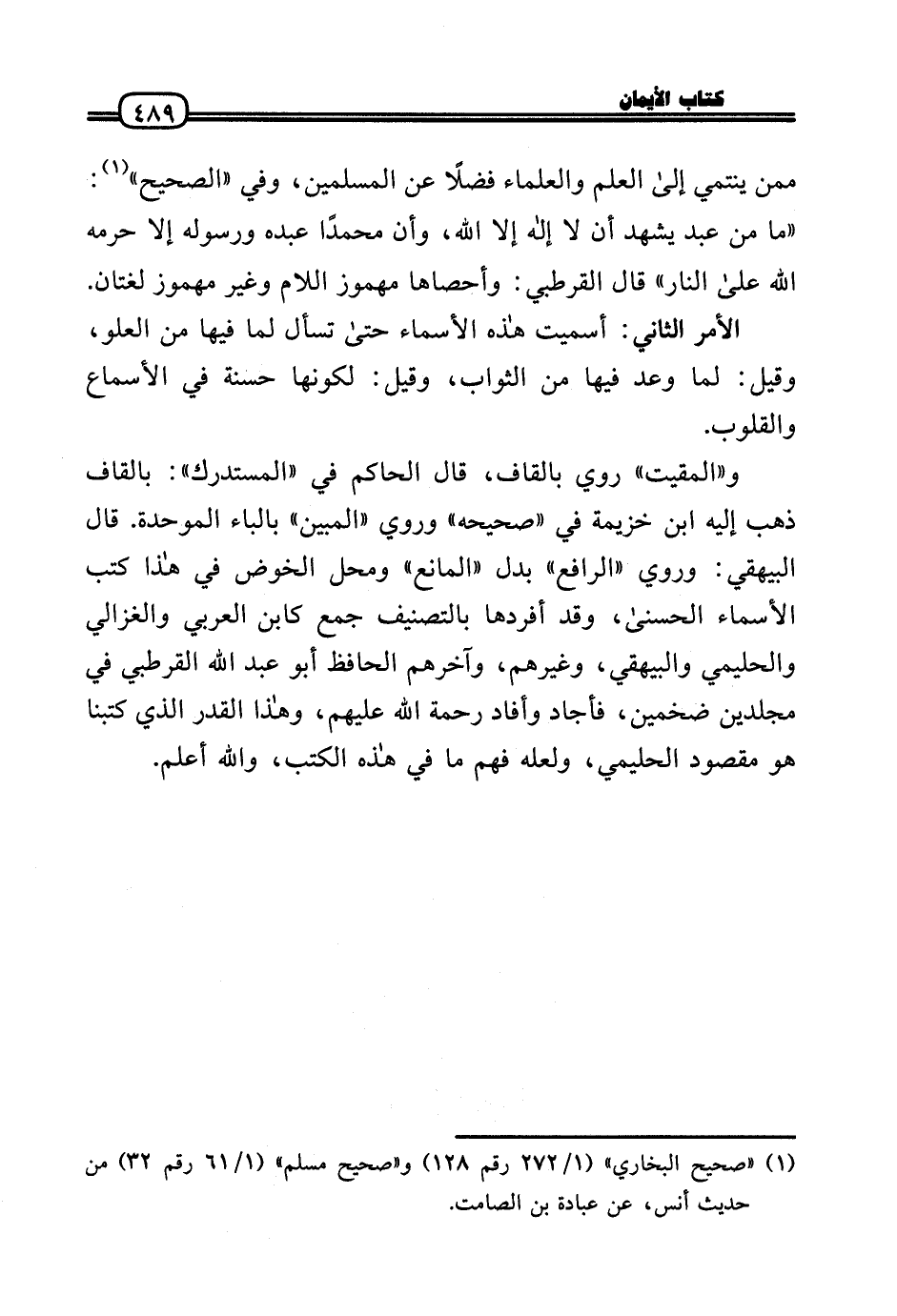 مِمَّن ينتمي إِلَى الْعلم وَالْعُلَمَاء فضلا عَن الْمُسلمين، وَفِي «الصَّحِيح» : «مَا من عبد يشْهد أَن لَا إِلَه إِلَّا الله، وَأَن مُحَمَّدًا عَبده وَرَسُوله إِلَّا حرمه الله عَلَى النَّار» قَالَ الْقُرْطُبِيّ: وأحصاها مَهْمُوز اللَّام وَغير مَهْمُوز لُغَتَانِ.