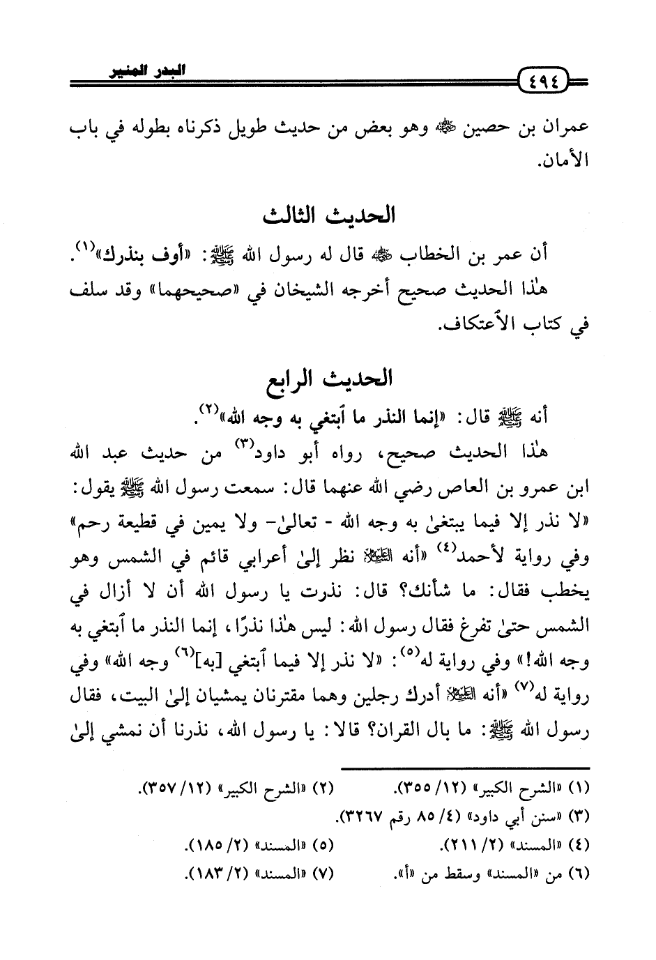 هَذَا الحَدِيث صَحِيح، رَوَاهُ أَبُو دَاوُد من حَدِيث عبد الله بن عَمْرو بن الْعَاصِ رَضِيَ اللَّهُ عَنْهما قَالَ: سَمِعت رَسُول الله - صَلَّى الله عَلَيْهِ وَسلم - يَقُول: «لَا نذر إِلَّا فِيمَا يبتغى بِهِ وَجه الله - تَعَالَى - وَلَا يَمِين فِي قطيعة رحم» وَفِي رِوَايَة لِأَحْمَد «أَنه عَلَيْهِ السَّلَام نظر إِلَى أَعْرَابِي قَائِم فِي الشَّمْس وَهُوَ يخْطب فَقَالَ: مَا شَأْنك؟ قَالَ: نذرت يَا رَسُول الله أَن لَا أَزَال فِي الشَّمْس حَتَّى تفرغ فَقَالَ رَسُول الله: لَيْسَ هَذَا نذرا، إِنَّمَا النّذر مَا ابْتغِي بِهِ وَجه الله!» وَفِي رِوَايَة لَهُ: «لَا نذر إِلَّا فِيمَا ابْتغِي [بِهِ] وَجه الله» وَفِي رِوَايَة لَهُ «أَنه عَلَيْهِ السَّلَام أدْرك رجلَيْنِ وهما مقترنان يمشيان إِلَى الْبَيْت، فَقَالَ رَسُول الله - صَلَّى الله عَلَيْهِ وَسلم -: مَا بَال الْقرَان؟ قَالَا: يَا رَسُول الله، نذرنا أَن نمشي إِلَى