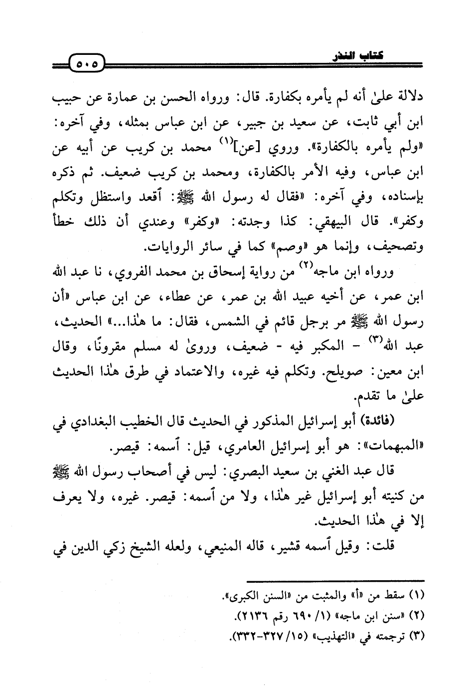 دلَالَة عَلَى أَنه لم يَأْمُرهُ بكفارة. قَالَ: وَرَوَاهُ الْحسن بن عمَارَة عَن حبيب بن أبي ثَابت، عَن سعيد بن جُبَير، عَن ابْن عَبَّاس بِمثلِهِ، وَفِي آخِره: «وَلم يَأْمُرهُ بِالْكَفَّارَةِ» . وَرُوِيَ [عَن] مُحَمَّد بن كريب عَن أَبِيه عَن ابْن عَبَّاس، وَفِيه الْأَمر بِالْكَفَّارَةِ، وَمُحَمّد بن كريب ضَعِيف. ثمَّ ذكره بِإِسْنَادِهِ، وَفِي آخِره: «فَقَالَ لَهُ رَسُول الله - صَلَّى الله عَلَيْهِ وَسلم -: اقعد واستظل وَتكلم وَكفر» . قَالَ الْبَيْهَقِيّ: كَذَا وجدته: «وَكفر» وَعِنْدِي أَن ذَلِك خطأ وتصحيف، وَإِنَّمَا هُوَ «وصم» كَمَا فِي سَائِر الرِّوَايَات.