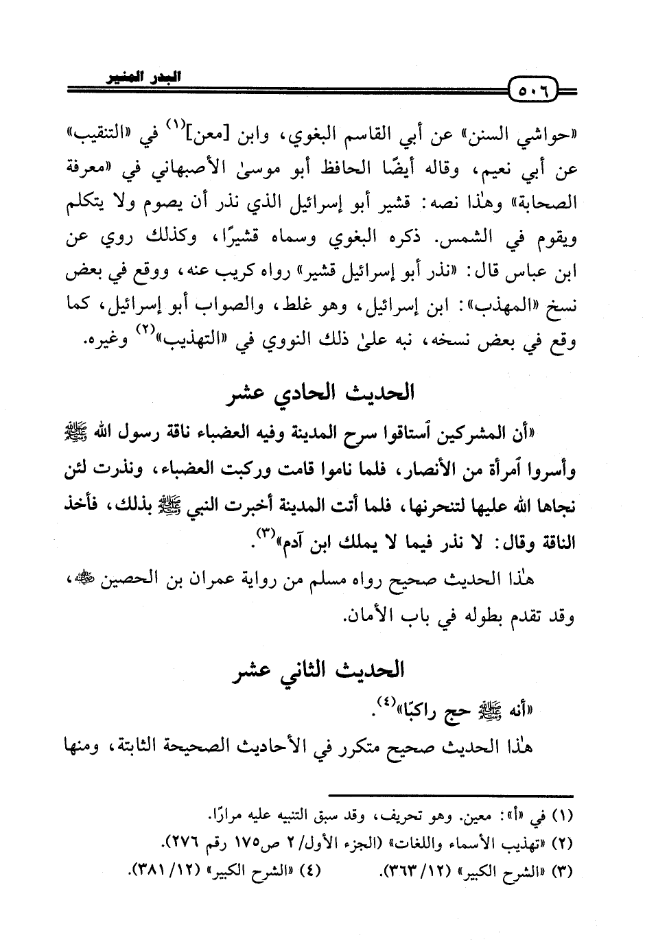 «حَوَاشِي السّنَن» عَن أبي الْقَاسِم الْبَغَوِيّ، وَابْن [معن] فِي «التنقيب» عَن أبي نعيم، وَقَالَهُ أَيْضا الْحَافِظ أَبُو مُوسَى الْأَصْبَهَانِيّ فِي «معرفَة الصَّحَابَة» وَهَذَا نَصه: قُشَيْر أَبُو إِسْرَائِيل الَّذِي نذر أَن يَصُوم وَلَا يتَكَلَّم وَيقوم فِي الشَّمْس. ذكره الْبَغَوِيّ وَسَماهُ قشيرًا، وَكَذَلِكَ رُوِيَ عَن ابْن عَبَّاس قَالَ: «نذر أَبُو إِسْرَائِيل قُشَيْر» رَوَاهُ كريب عَنهُ، وَوَقع فِي بعض نسخ «الْمُهَذّب» : ابْن إِسْرَائِيل، وَهُوَ غلط، وَالصَّوَاب أَبُو إِسْرَائِيل، كَمَا وَقع فِي بعض نسخه، نبه عَلَى ذَلِك النَّوَوِيّ فِي «التَّهْذِيب» وَغَيره.