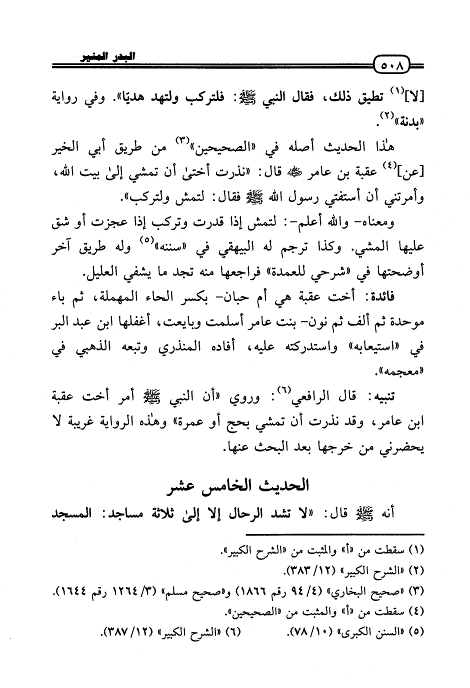 تَنْبِيه: قَالَ الرَّافِعِيّ: وَرُوِيَ «أَن النَّبِي - صَلَّى الله عَلَيْهِ وَسلم - أَمر أُخْت عقبَة بن عَامر، وَقد نذرت أَن تمشي بِحَجّ أَو عمْرَة» وَهَذِه الرِّوَايَة غَرِيبَة لَا يحضرني من خرجها بعد الْبَحْث عَنْهَا.