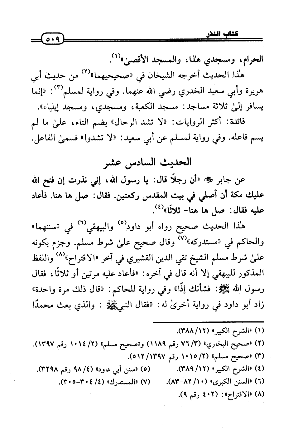 عَن جَابر رَضِيَ اللَّهُ عَنْه «أَن رجلا قَالَ: يَا رَسُول الله، إِنِّي نذرت إِن فتح الله عَلَيْك مَكَّة أَن أُصَلِّي فِي بَيت الْمُقَدّس رَكْعَتَيْنِ. فَقَالَ: صل هَا هُنَا. فَأَعَادَ عَلَيْهِ فَقَالَ: صل هَا هُنَا - ثَلَاثًا» .
