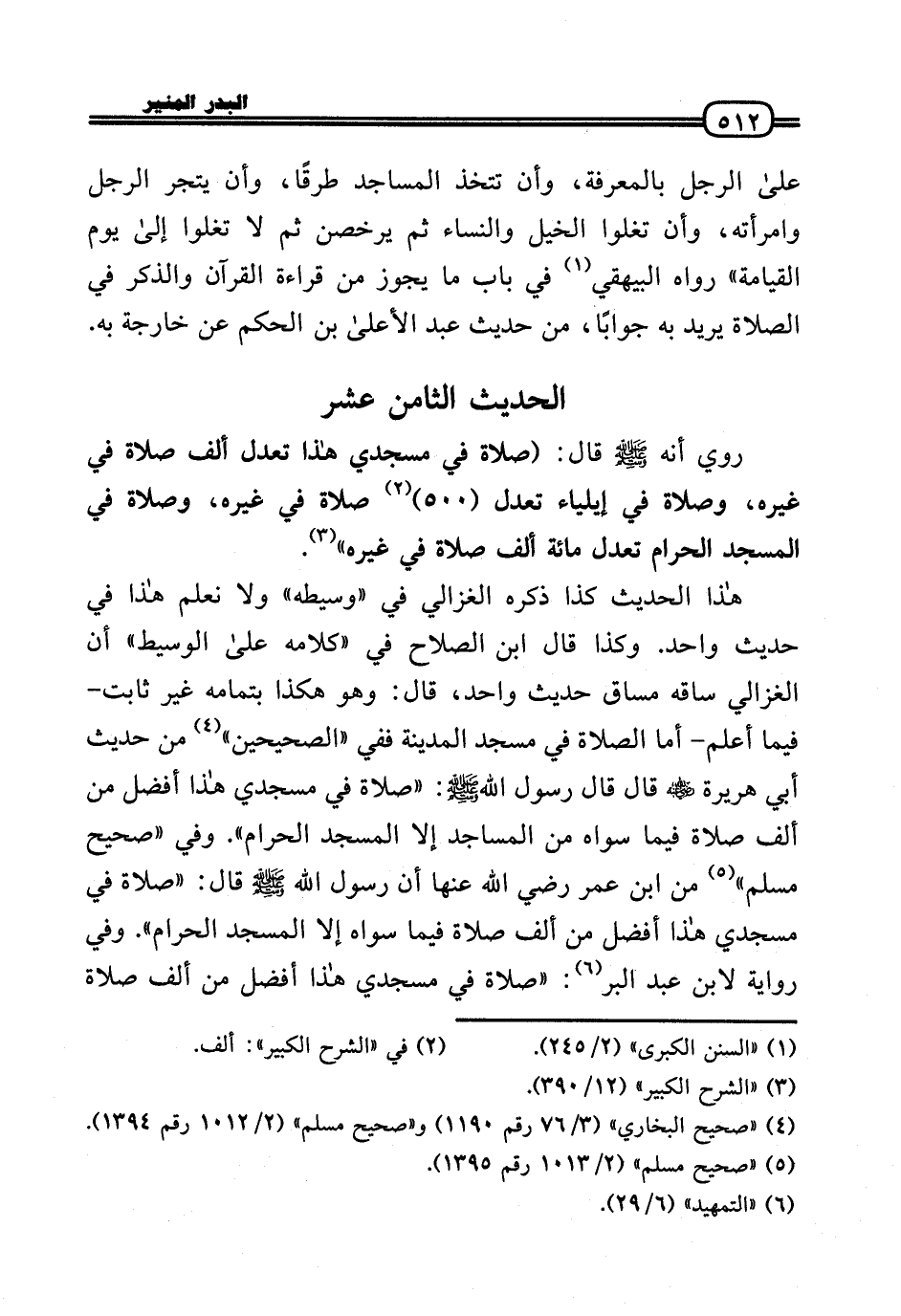 هَذَا الحَدِيث كَذَا ذكره الْغَزالِيّ فِي «وسيطه» وَلَا نعلم هَذَا فِي حَدِيث وَاحِد. وَكَذَا قَالَ ابْن الصّلاح فِي «كَلَامه عَلَى الْوَسِيط» أَن الْغَزالِيّ سَاقه مساق حَدِيث وَاحِد، قَالَ: وَهُوَ هَكَذَا بِتَمَامِهِ غير ثَابت - فِيمَا أعلم - أما الصَّلَاة فِي مَسْجِد الْمَدِينَة فَفِي «الصَّحِيحَيْنِ» من حَدِيث أبي هُرَيْرَة رَضِيَ اللَّهُ عَنْه قَالَ قَالَ رَسُول الله - صَلَّى الله عَلَيْهِ وَسلم -: «صَلَاة فِي مَسْجِدي هَذَا أفضل من ألف صَلَاة فِيمَا سواهُ من الْمَسَاجِد إِلَّا الْمَسْجِد الْحَرَام» . وَفِي «صَحِيح مُسلم» من ابْن عمر رَضِيَ اللَّهُ عَنْها أَن رَسُول الله - صَلَّى الله عَلَيْهِ وَسلم - قَالَ: «صَلَاة فِي مَسْجِدي هَذَا أفضل من ألف صَلَاة فِيمَا سواهُ إِلَّا الْمَسْجِد الْحَرَام» . وَفِي رِوَايَة لِابْنِ عبد الْبر: «صَلَاة فِي مَسْجِدي هَذَا أفضل من ألف صَلَاة