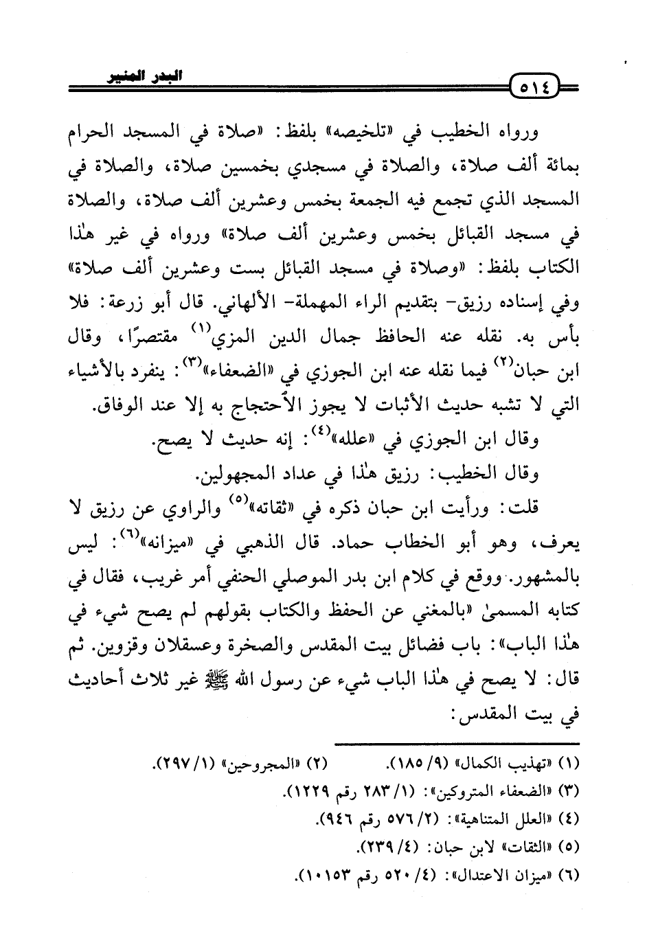 قلت: وَرَأَيْت ابْن حبَان ذكره فِي «ثقاته» والراوي عَن رُزَيْق لَا يعرف، وَهُوَ أَبُو الْخطاب حَمَّاد. قَالَ الذَّهَبِيّ فِي «مِيزَانه» : لَيْسَ بالمشهور. وَوَقع فِي كَلَام ابْن بدر الْموصِلِي الْحَنَفِيّ أَمر غَرِيب، فَقَالَ فِي كِتَابه الْمُسَمَّى «بالمغني عَن الْحِفْظ وَالْكتاب بقَوْلهمْ لم يَصح شَيْء فِي هَذَا الْبَاب» : بَاب فَضَائِل بَيت الْمُقَدّس والصخرة وعسقلان وقزوين. ثمَّ قَالَ: لَا يَصح فِي هَذَا الْبَاب شَيْء عَن رَسُول الله - صَلَّى الله عَلَيْهِ وَسلم - غير ثَلَاث أَحَادِيث فِي بَيت الْمُقَدّس: