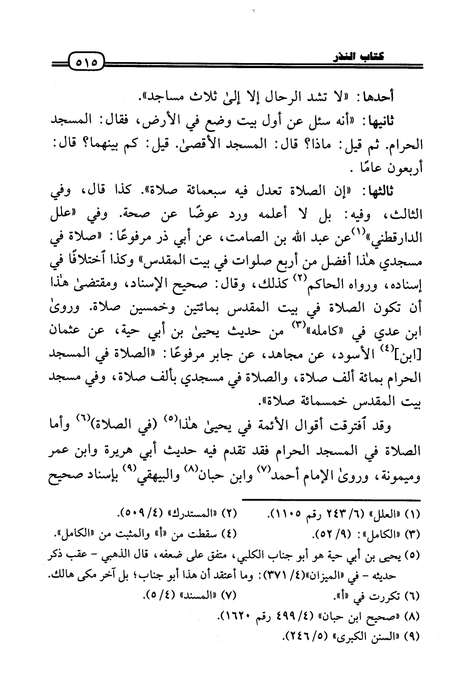 ثَالِثهَا: «إِن الصَّلَاة تعدل فِيهِ سَبْعمِائة صَلَاة» . كَذَا قَالَ، وَفِي الثَّالِث، وَفِيه: بل لَا أعلمهُ ورد عوضا عَن صِحَة. وَفِي «علل الدَّارَقُطْنِيّ» عَن عبد الله بن الصَّامِت، عَن أبي ذَر مَرْفُوعا: «صَلَاة فِي مَسْجِدي هَذَا أفضل من أَربع صلوَات فِي بَيت الْمُقَدّس» وَكَذَا اخْتِلَافا فِي إِسْنَاده، وَرَوَاهُ الْحَاكِم كَذَلِك، وَقَالَ: صَحِيح الْإِسْنَاد، وَمُقْتَضَى هَذَا أَن تكون الصَّلَاة فِي بَيت الْمُقَدّس بمائتين وَخمسين صَلَاة. وَرَوَى ابْن عدي فِي «كَامِله» من حَدِيث يَحْيَى بن أبي حَيَّة، عَن عُثْمَان [بن] الْأسود، عَن مُجَاهِد، عَن جَابر مَرْفُوعا: «الصَّلَاة فِي الْمَسْجِد الْحَرَام بِمِائَة ألف صَلَاة، وَالصَّلَاة فِي مَسْجِدي بِأَلف صَلَاة، وَفِي مَسْجِد بَيت الْمُقَدّس خَمْسمِائَة صَلَاة» .