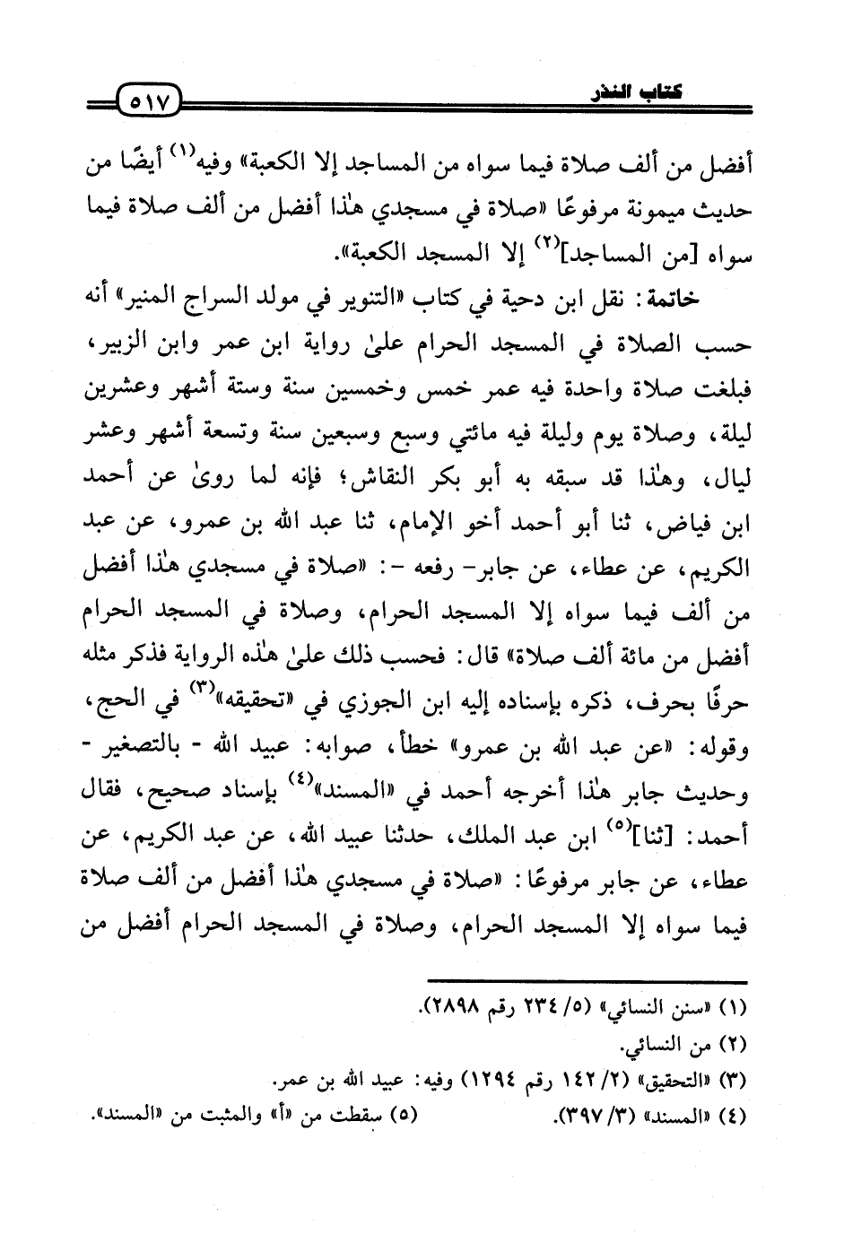 خَاتِمَة: نقل ابْن دحْيَة فِي كتاب «التَّنْوِير فِي مولد السراج الْمُنِير» أَنه حسب الصَّلَاة فِي الْمَسْجِد الْحَرَام عَلَى رِوَايَة ابْن عمر وَابْن الزبير، فبلغت صَلَاة وَاحِدَة فِيهِ عمر خمس وَخمسين سنة وَسِتَّة أشهر وَعشْرين لَيْلَة، وَصَلَاة يَوْم وَلَيْلَة فِيهِ مِائَتي وَسبع وَسبعين سنة وَتِسْعَة أشهر وَعشر لَيَال، وَهَذَا قد سبقه بِهِ أَبُو بكر النقاش؛ فَإِنَّهُ لما رَوَى عَن أَحْمد بن فياض، ثَنَا أَبُو أَحْمد أَخُو الإِمَام، ثَنَا عبد الله بن عَمْرو، عَن عبد الْكَرِيم، عَن عَطاء، عَن جَابر - رَفعه -: «صَلَاة فِي مَسْجِدي هَذَا أفضل من ألف فِيمَا سواهُ إِلَّا الْمَسْجِد الْحَرَام، وَصَلَاة فِي الْمَسْجِد الْحَرَام أفضل من مائَة ألف صَلَاة» قَالَ: فَحسب ذَلِك عَلَى هَذِه الرِّوَايَة فَذكر مثله حرفا بِحرف، ذكره بِإِسْنَادِهِ إِلَيْهِ ابْن الْجَوْزِيّ فِي «تَحْقِيقه» فِي الْحَج، وَقَوله: «عَن عبد الله بن عَمْرو» خطأ، صَوَابه: عبيد الله - بِالتَّصْغِيرِ - وَحَدِيث جَابر هَذَا أخرجه أَحْمد فِي «الْمسند» بِإِسْنَاد صَحِيح، فَقَالَ أَحْمد: [ثَنَا] ابْن عبد الْملك، حَدثنَا عبيد الله، عَن عبد الْكَرِيم، عَن عَطاء، عَن جَابر مَرْفُوعا: «صَلَاة فِي مَسْجِدي هَذَا أفضل من ألف صَلَاة فِيمَا سواهُ إِلَّا الْمَسْجِد الْحَرَام، وَصَلَاة فِي الْمَسْجِد الْحَرَام أفضل من