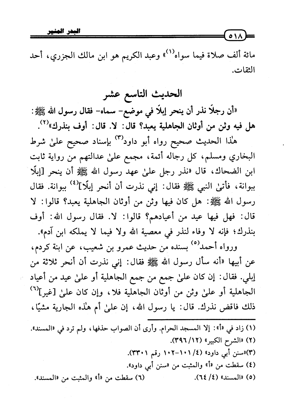 هَذَا الحَدِيث صَحِيح رَوَاهُ أَبُو دَاوُد بِإِسْنَاد صَحِيح عَلَى شَرط البُخَارِيّ وَمُسلم، كل رِجَاله أَئِمَّة، مجمع عَلَى عدالتهم من رِوَايَة ثَابت بَين الضَّحَّاك، قَالَ «نذر رجل عَلَى عهد رَسُول الله - صَلَّى الله عَلَيْهِ وَسلم - أَن ينْحَر [إبِلا ببوانة، فَأَتَى النَّبِي - صَلَّى الله عَلَيْهِ وَسلم - فَقَالَ: إِنِّي نذرت أَن أنحر إبِلا] ببوانة. فَقَالَ رَسُول الله - صَلَّى الله عَلَيْهِ وَسلم -: هَل كَانَ فِيهَا وثن من أوثان الْجَاهِلِيَّة يعبد؟ قَالُوا: لَا قَالَ: فَهَل فِيهَا عيد من أعيادهم؟ قَالُوا: لَا. فَقَالَ رَسُول الله: أوف بِنَذْرِك؛ فَإِنَّهُ لَا وَفَاء لنذر فِي مَعْصِيّة الله وَلَا فِيمَا لَا يملكهُ ابْن آدم» .