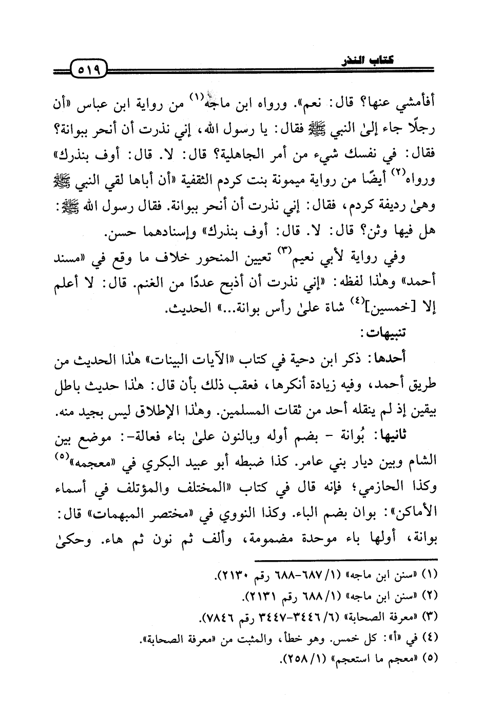 أفأمشي، عَنْهَا؟ قَالَ نعم» . وَرَوَاهُ ابْن مَاجَه من رِوَايَة ابْن عَبَّاس «أَن رجلا جَاءَ إِلَى النَّبِي - صَلَّى الله عَلَيْهِ وَسلم - فَقَالَ: يَا رَسُول الله، إِنِّي نذرت أَن أنحر ببوانة؟ فَقَالَ: فِي نَفسك شَيْء من أَمر الْجَاهِلِيَّة؟ قَالَ: لَا. قَالَ: أوف بِنَذْرِك» وَرَوَاهُ أَيْضا من رِوَايَة مَيْمُونَة بنت كردم الثقفية «أَن أَبَاهَا لَقِي النَّبِي - صَلَّى الله عَلَيْهِ وَسلم - وهى رديفة كردم، فَقَالَ: إِنِّي نذرت أَن أنحر ببوانة. فَقَالَ رَسُول الله - صَلَّى الله عَلَيْهِ وَسلم -: هَل فِيهَا وثن؟ قَالَ: لَا. قَالَ: أوف بِنَذْرِك» وإسنادهما حسن.