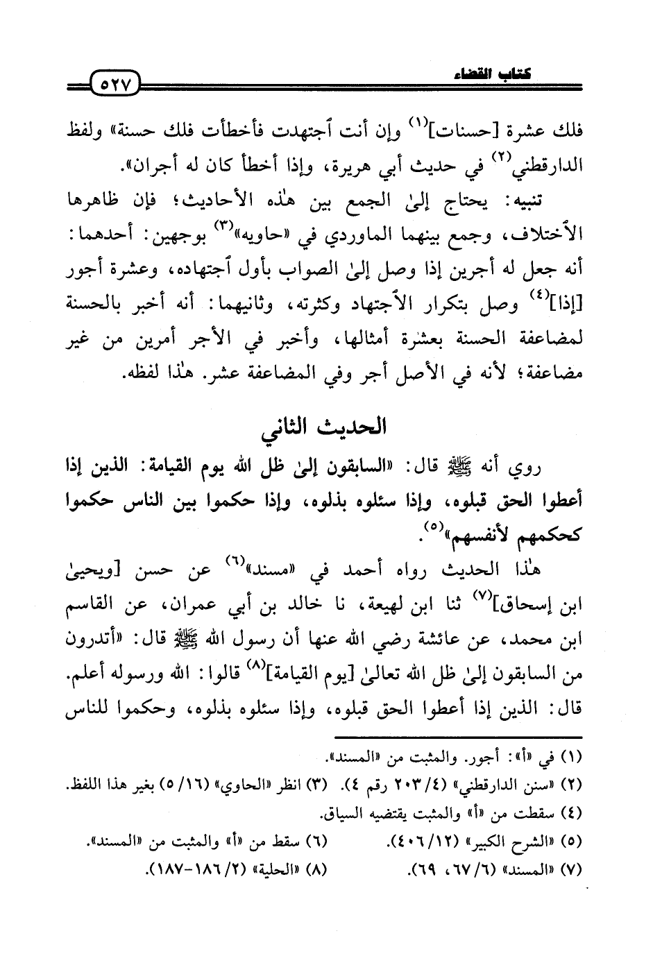 هَذَا الحَدِيث رَوَاهُ أَحْمد فِي «مُسْند» عَن حسن [وَيَحْيَى بن إِسْحَاق] ثَنَا ابْن لَهِيعَة، نَا خَالِد بن أبي عمرَان، عَن الْقَاسِم بن مُحَمَّد، عَن عَائِشَة رَضِيَ اللَّهُ عَنْها أَن رَسُول الله - صَلَّى الله عَلَيْهِ وَسلم - قَالَ: «أَتَدْرُونَ من السَّابِقُونَ إِلَى ظلّ الله تَعَالَى [يَوْم الْقِيَامَة] قَالُوا: الله وَرَسُوله أعلم. قَالَ: الَّذين إِذا أعْطوا الْحق قبلوه، وَإِذا سئلوه بذلوه، وحكموا للنَّاس