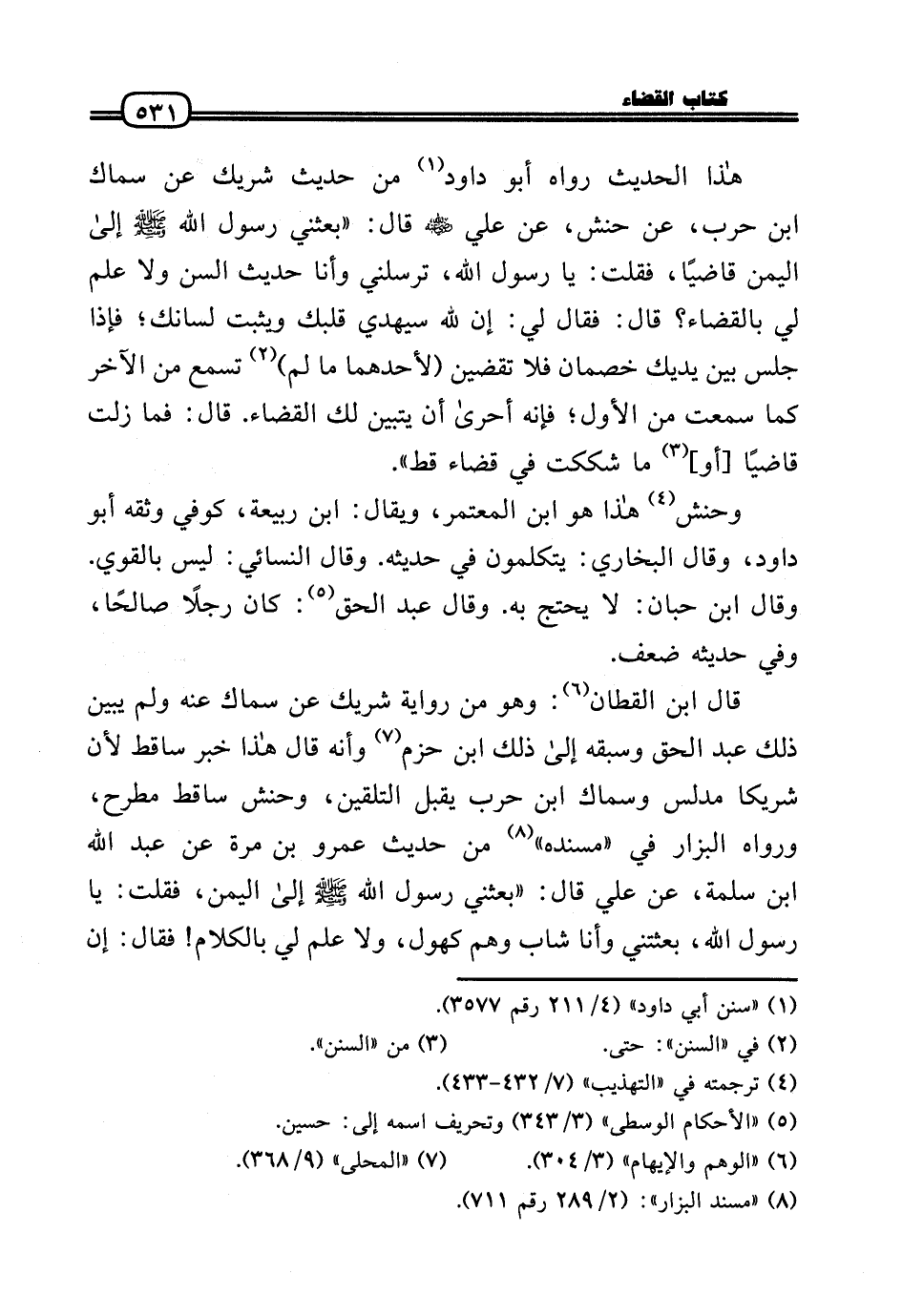 قَالَ ابْن الْقطَّان: وَهُوَ من رِوَايَة شريك عَن سماك عَنهُ وَلم يبين ذَلِك عبد الْحق وَسَبقه إِلَى ذَلِك ابْن حزم وَأَنه قَالَ هَذَا خبر سَاقِط لِأَن شَرِيكا مُدَلّس وَسماك ابْن حَرْب يقبل التَّلْقِين، وحنش سَاقِط مطرح، وَرَوَاهُ الْبَزَّار فِي «مُسْنده» من حَدِيث عَمْرو بن مرّة عَن عبد الله بن سَلمَة، عَن عَلّي قَالَ: «بَعَثَنِي رَسُول الله - صَلَّى الله عَلَيْهِ وَسلم - إِلَى الْيمن، فَقلت: يَا رَسُول الله، بعثتني وَأَنا شَاب وهم كهول، وَلَا علم لي بالْكلَام! فَقَالَ: إِن