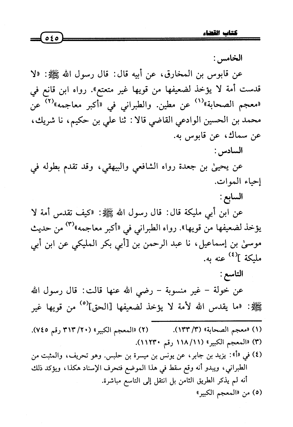 عَن قَابُوس بن الْمخَارِق، عَن أَبِيه قَالَ: قَالَ رَسُول الله - صَلَّى الله عَلَيْهِ وَسلم -: «لَا قدست أمة لَا يُؤْخَذ لضعيفها من قويها غير متعتع» . رَوَاهُ ابْن قَانِع فِي «مُعْجم الصَّحَابَة» عَن مطين. وَالطَّبَرَانِيّ فِي «أكبر معاجمه» عَن مُحَمَّد بن الْحُسَيْن الوادعي القَاضِي قَالَا: ثَنَا عَلّي بن حَكِيم، نَا شريك، عَن سماك، عَن قَابُوس بِهِ.