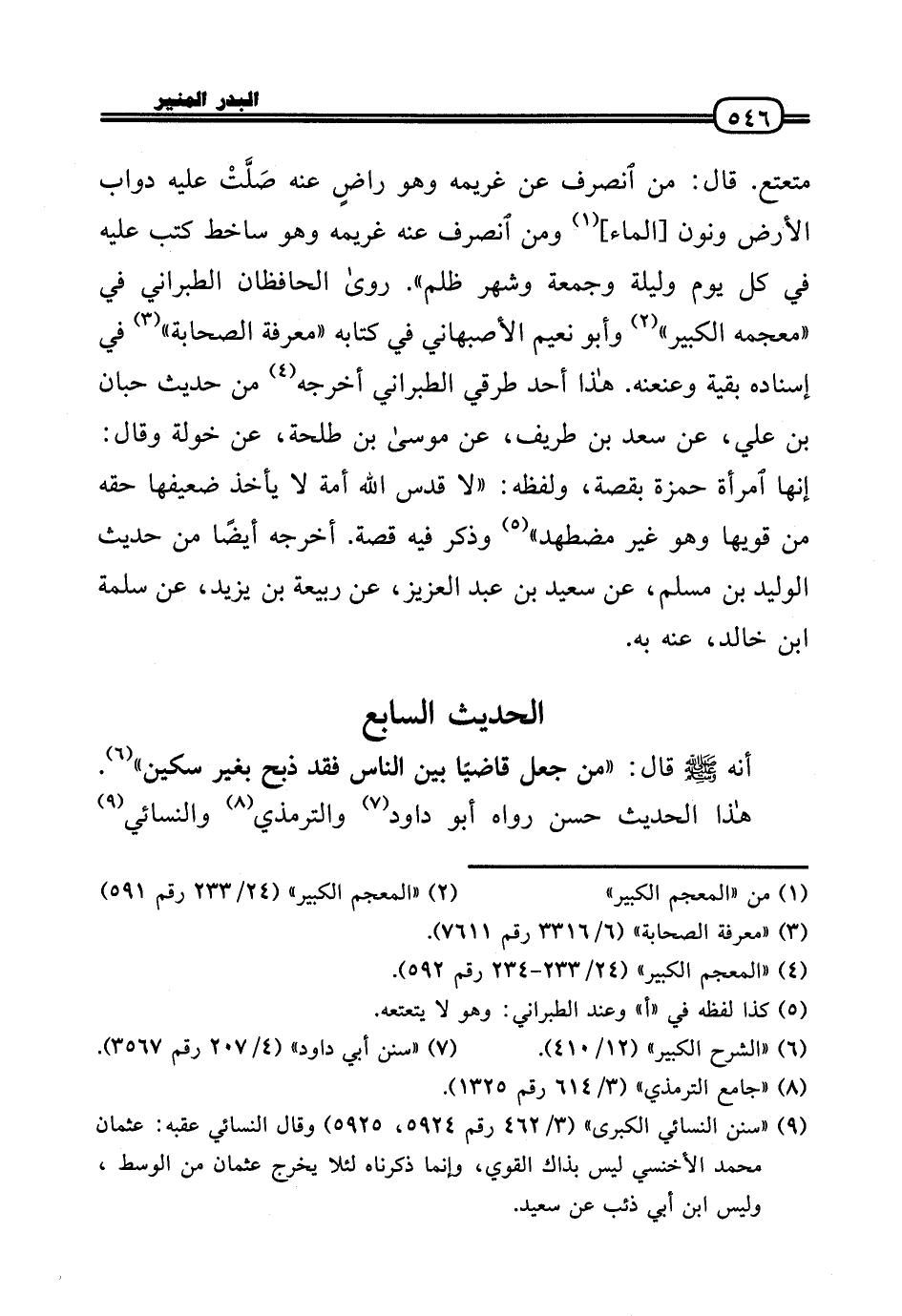 متعتع. قَالَ: من انْصَرف عَن غَرِيمه وَهُوَ راضٍ عَنهُ صَلَّتْ عَلَيْهِ دَوَاب الأَرْض وَنون [المَاء] وَمن انْصَرف عَنهُ غَرِيمه وَهُوَ ساخط كتب عَلَيْهِ فِي كل يَوْم وَلَيْلَة وجمعة وَشهر ظلم» . رَوَى الحافظان الطَّبَرَانِيّ فِي «مُعْجَمه الْكَبِير» وَأَبُو نعيم الْأَصْبَهَانِيّ فِي كِتَابه «معرفَة الصَّحَابَة» فِي إِسْنَاده بَقِيَّة وعنعنه. هَذَا أحد طرقي الطَّبَرَانِيّ أخرجه من حَدِيث حبَان بن عَلّي، عَن سعد بن طريف، عَن مُوسَى بن طَلْحَة، عَن خَوْلَة وَقَالَ: إِنَّهَا امْرَأَة حَمْزَة بِقصَّة، وَلَفظه: «لَا قدس الله أمة لَا يَأْخُذ ضعيفها حَقه من قويها وَهُوَ غير مضطهد» وَذكر فِيهِ قصَّة. أخرجه أَيْضا من حَدِيث الْوَلِيد بن مُسلم، عَن سعيد بن عبد الْعَزِيز، عَن ربيعَة بن يزِيد، عَن سَلمَة بن خَالِد، عَنهُ بِهِ.
