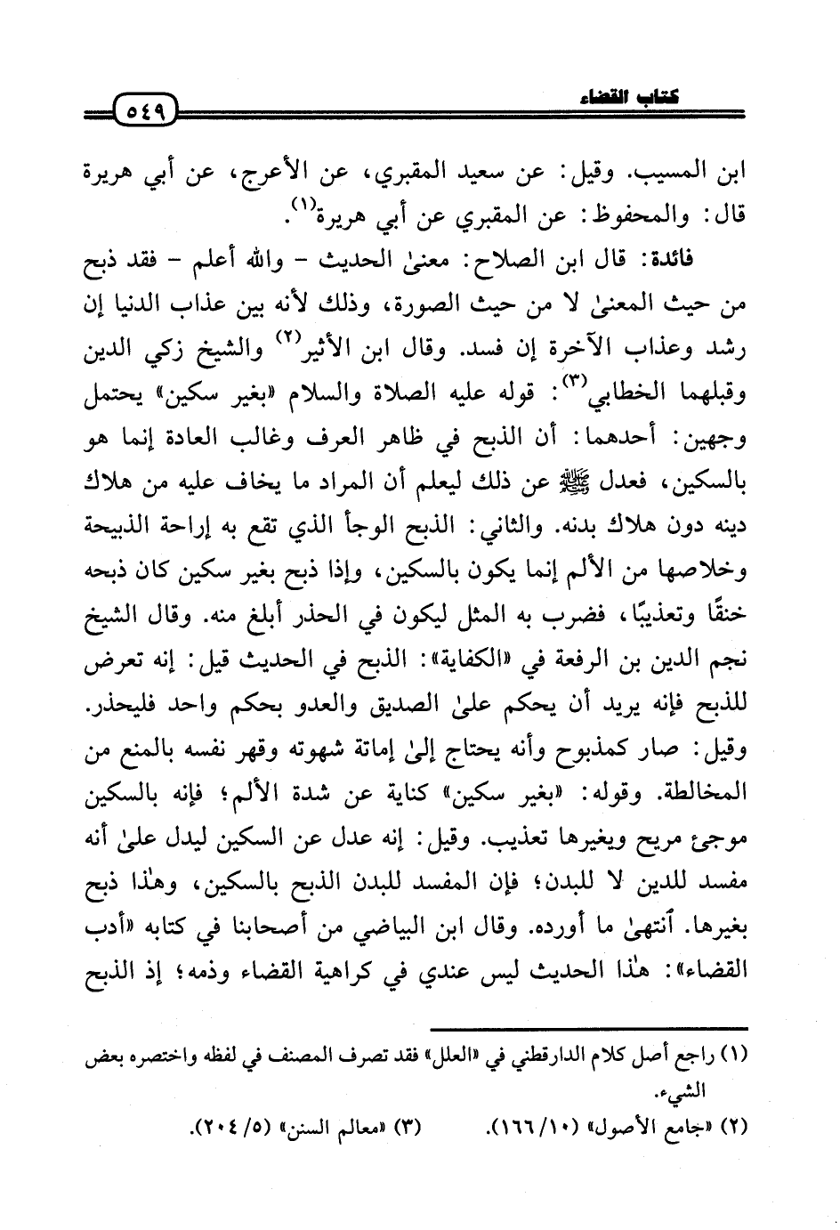 فَائِدَة: قَالَ ابْن الصّلاح: مَعْنَى الحَدِيث - وَالله أعلم - فقد ذبح من حَيْثُ الْمَعْنى لَا من حَيْثُ الصُّورَة، وَذَلِكَ لِأَنَّهُ بَين عَذَاب الدُّنْيَا إِن رشد وَعَذَاب الْآخِرَة إِن فسد. وَقَالَ ابْن الْأَثِير وَالشَّيْخ زكي الدَّين وقبلهما الْخطابِيّ: قَوْله عَلَيْهِ الصَّلَاة وَالسَّلَامُ «بِغَيْر سكين» يحْتَمل وَجْهَيْن: أَحدهمَا: أَن الذّبْح فِي ظَاهر الْعرف وغالب الْعَادة إِنَّمَا هُوَ بالسكين، فَعدل (عَن ذَلِك ليعلم أَن المُرَاد مَا يخَاف عَلَيْهِ من هَلَاك دينه دون هَلَاك بدنه. وَالثَّانِي: الذّبْح الوجأ الَّذِي تقع بِهِ إراحة الذَّبِيحَة وخلاصها من الْأَلَم إِنَّمَا يكون بالسكين، وَإِذا ذبح بِغَيْر سكين كَانَ ذبحه خنقًا وتعذيبًا، فَضرب بِهِ الْمثل ليَكُون فِي الحذر أبلغ مِنْهُ. وَقَالَ الشَّيْخ نجم الدَّين بن الرّفْعَة فِي «الْكِفَايَة» : الذّبْح فِي الحَدِيث قيل: إِنَّه تعرض للذبح فَإِنَّهُ يُرِيد أَن يحكم عَلَى الصّديق والعدو بِحكم وَاحِد فليحذر. وَقيل: صَار كمذبوح وَأَنه يحْتَاج إِلَى إماتة شَهْوَته وقهر نَفسه بِالْمَنْعِ من المخالطة. وَقَوله: «بِغَيْر سكين» كِنَايَة عَن شدَّة الْأَلَم؛ فَإِنَّهُ بالسكين موجئ مريح ويغيرها تَعْذِيب. وَقيل: إِنَّه عدل عَن السكين ليدل عَلَى أَنه مُفسد للدّين لَا للبدن؛ فَإِن الْمُفْسد للبدن الذّبْح بالسكين، وَهَذَا ذبح بغَيْرهَا. انْتَهَى مَا أوردهُ. وَقَالَ ابْن البياضي من أَصْحَابنَا فِي كِتَابه «أدب الْقَضَاء» : هَذَا الحَدِيث لَيْسَ عِنْدِي فِي كَرَاهِيَة الْقَضَاء وذمه؛ إِذْ الذّبْح
