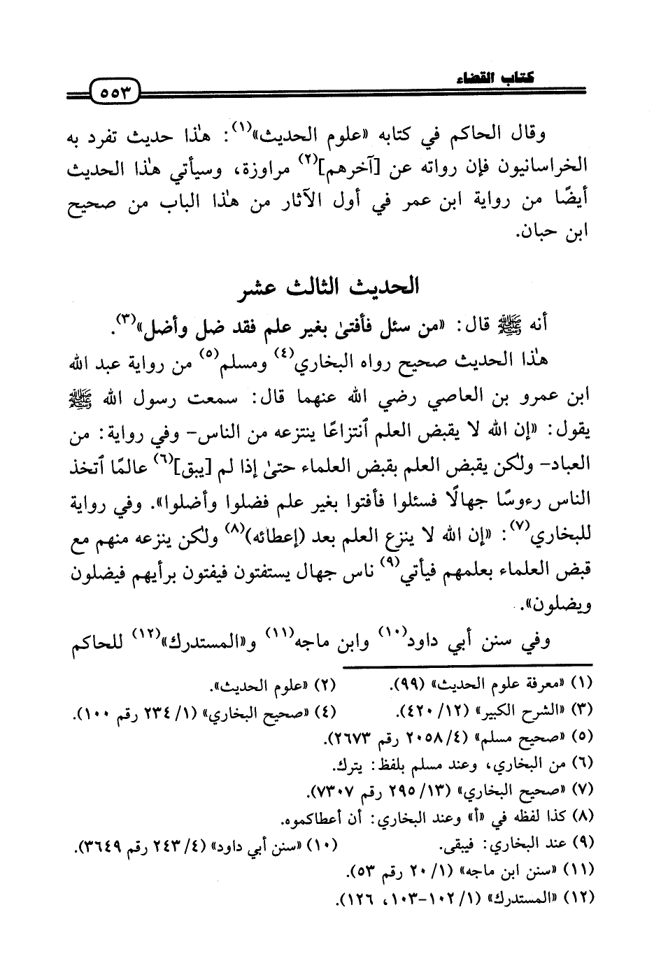 هَذَا الحَدِيث صَحِيح رَوَاهُ البُخَارِيّ وَمُسلم من رِوَايَة عبد الله بن عَمْرو بن العَاصِي رَضِيَ اللَّهُ عَنْهما قَالَ: سَمِعت رَسُول الله - صَلَّى الله عَلَيْهِ وَسلم - يَقُول: «إِن الله لَا يقبض الْعلم انتزاعًا ينتزعه من النَّاس - وَفِي رِوَايَة: من الْعباد - وَلَكِن يقبض الْعلم بِقَبض الْعلمَاء حَتَّى إِذا لم [يبْق] عَالما اتخذ النَّاس رُءُوسًا جُهَّالًا فسئلوا فأفتوا بِغَيْر علم فضلوا وأضلوا» . وَفِي رِوَايَة للْبُخَارِيّ: «إِن الله لَا ينْزع الْعلم بعد (إِعْطَائِهِ) وَلَكِن يَنْزعهُ مِنْهُم مَعَ قبض الْعلمَاء بعلمهم فَيَأْتِي نَاس جهال يستفتون فيفتون برأيهم فيضلون ويضلون» .