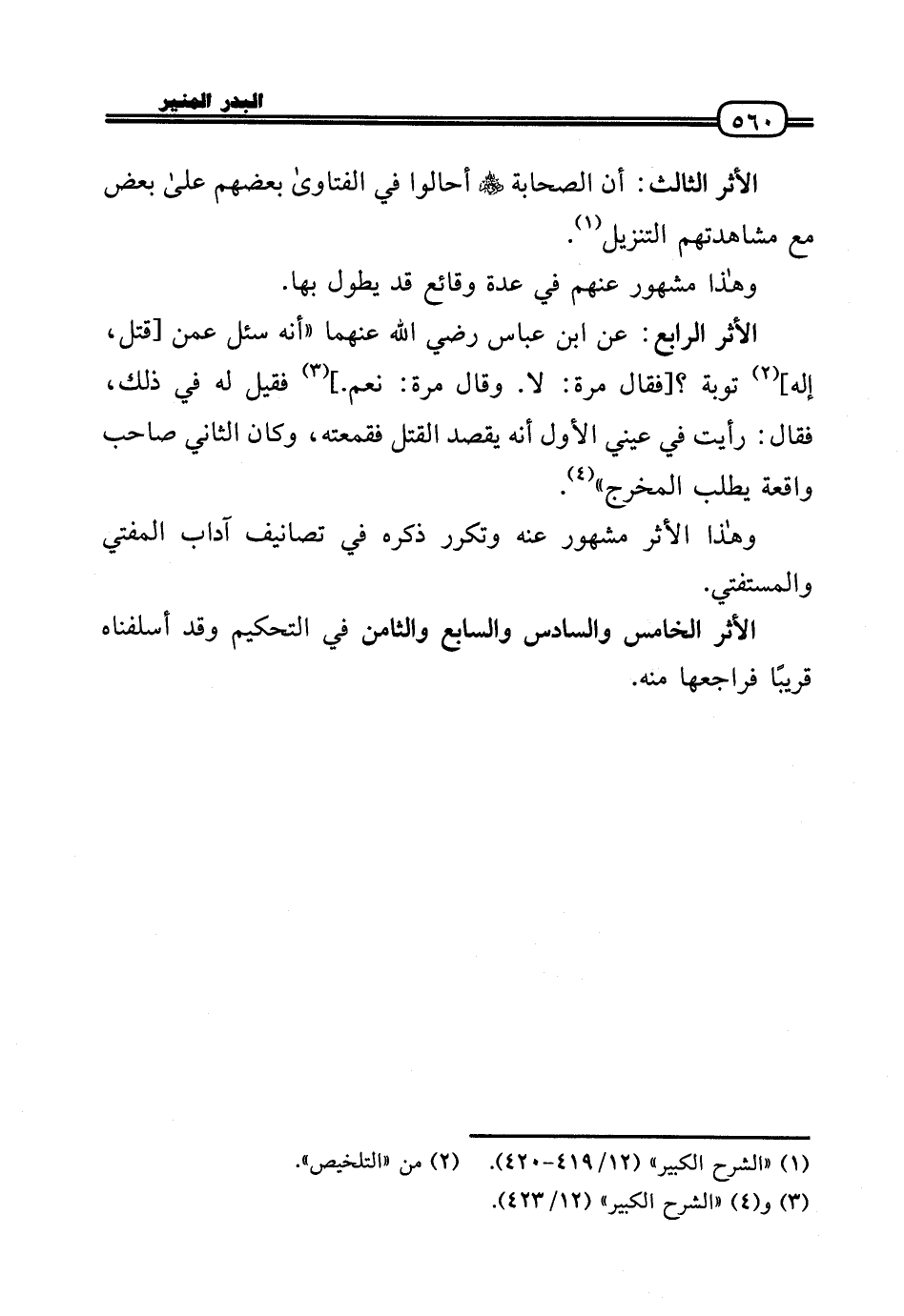 عَن ابْن عَبَّاس رَضِيَ اللَّهُ عَنْهما «أَنه سُئِلَ عَمَّن [قتل أَله] تَوْبَة؟ [فَقَالَ مرّة: لَا. وَقَالَ مرّة: نعم.] فَقيل لَهُ فِي ذَلِك، فَقَالَ: رَأَيْت فِي عَيْني الأول أَنه يقْصد الْقَتْل فقمعته، وَكَانَ الثَّانِي صَاحب وَاقعَة يطْلب الْمخْرج» .