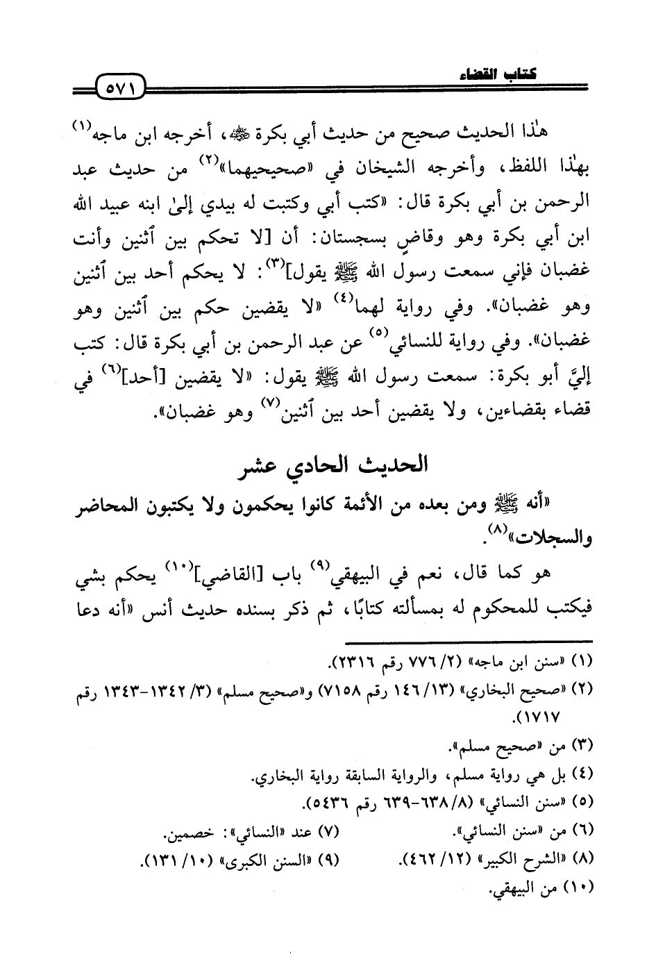 هَذَا الحَدِيث صَحِيح من حَدِيث أبي بكرَة رَضِيَ اللَّهُ عَنْه أخرجه ابْن مَاجَه بِهَذَا اللَّفْظ وَأخرجه الشَّيْخَانِ فِي «صَحِيحَيْهِمَا» من حَدِيث عبد الرَّحْمَن بن أبي بكرَة قَالَ: «كتب أبي وكتبت لَهُ بيَدي إِلَى ابْنه عبيد الله بن أبي بكرَة وَهُوَ وقاضٍ بسجستان: أَن [لَا تحكم بَين اثْنَيْنِ وَأَنت غَضْبَان فَإِنِّي سَمِعت رَسُول الله - صَلَّى الله عَلَيْهِ وَسلم - يَقُول] : لَا يحكم أحد بَين اثْنَيْنِ وَهُوَ غَضْبَان» . وَفِي رِوَايَة لَهما «لَا يقضين حكم بَين اثْنَيْنِ وَهُوَ غَضْبَان» . وَفِي رِوَايَة للنسائي عَن عبد الرَّحْمَن بن أبي بكرَة قَالَ: كتب إليَّ أَبُو بكرَة: سَمِعت رَسُول الله - صَلَّى الله عَلَيْهِ وَسلم - يَقُول: «لَا يقضين [أحد] فِي قَضَاء بقضاءين وَلَا يقضين أحد بَين اثْنَيْنِ وَهُوَ غَضْبَان» .