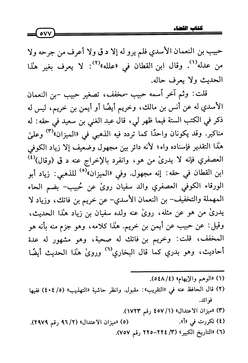 حبيب بن النُّعْمَان الْأَسدي فَلم يرو لَهُ إِلَّا (د ق) وَلَا أعرف من جرحه وَلَا من عدله. وَقَالَ ابْن الْقطَّان فِي «علله» لَا يعرف بِغَيْر هَذَا الحَدِيث وَلَا يعرف حَاله. قلت: ثمَّ آخر اسْمه حبيب - مخفف، تَصْغِير حبيب بن النُّعْمَان الْأَسدي - لَهُ عَن أنس بن مَالك، وخريم أَيْضا أَو أَيمن بن خريم لَيْسَ لَهُ ذكر فِي الْكتب السِّتَّة فِيمَا ظهر لي، قَالَ عبد الْغَنِيّ بن سعيد فِي حَقه: لَهُ مَنَاكِير. وَقد يكونَانِ وَاحِدًا كَمَا تردد فِيهِ الذَّهَبِيّ فِي «الْمِيزَان» وَعَلَى هَذَا التَّقْدِير فإسناده واه؛ لِأَنَّهُ دائر بَين مَجْهُول وَضَعِيف إِلَّا زِيَاد الْكُوفِي الْعُصْفُرِي فَإِنَّهُ لَا يُدْرَى من هُوَ، وَانْفَرَدَ بِالْإِخْرَاجِ عَنهُ د ق (وَقَالَ) ابْن الْقطَّان فِي حَقه: إِنَّه مَجْهُول. وَفِي «الْمِيزَان» للذهبي: زِيَاد أَبُو الورقاء الْكُوفِي الْعُصْفُرِي وَالِد سُفْيَان رَوَى عَن حُبيب - بِضَم الْحَاء الْمُهْملَة وَالتَّخْفِيف - بن النُّعْمَان الْأَسدي عَن خريم بن فاتك، وَزِيَاد لَا يُدْرَى من هُوَ عَن مثله، رَوَى عَنهُ وَلَده سُفْيَان بن زِيَاد هَذَا الحَدِيث، وَقيل: عَن حبيب عَن أَيمن بن خريم. هَذَا كَلَامه، وَهُوَ جزم مِنْهُ بِأَنَّهُ هُوَ المخفف، قلت: وخريم بن فاتك لَهُ صُحْبَة، وَهُوَ مَشْهُور لَهُ عدَّة أَحَادِيث، وَهُوَ بَدْرِي كَمَا قَالَ البُخَارِيّ وَرَوَى هَذَا الحَدِيث أَيْضا