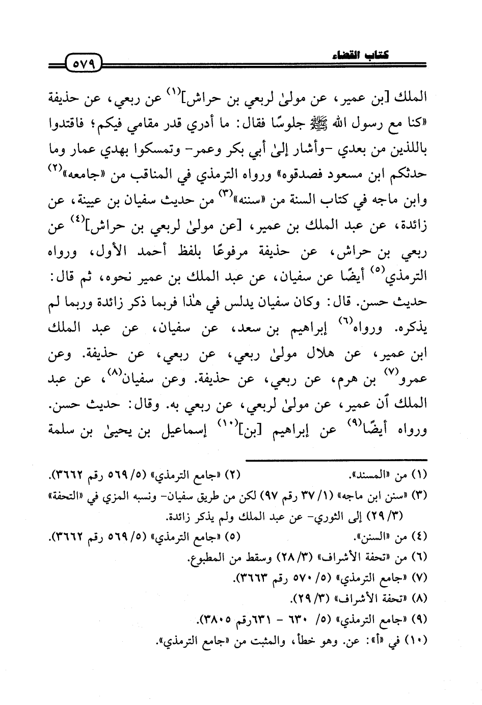 الْملك [بن عُمَيْر، عَن مولَى لربعي بن حِرَاش] عَن ربعي، عَن حُذَيْفَة «كُنَّا مَعَ رَسُول الله - صَلَّى الله عَلَيْهِ وَسلم - جُلُوسًا فَقَالَ: مَا أَدْرِي قدر مقَامي فِيكُم؛ فاقتدوا باللذين من بعدِي، وَأَشَارَ إِلَى أبي بكر وَعمر، وتمسكوا بِهَدي عمار وَمَا حَدثكُمْ ابْن مَسْعُود فصدقوه» وَرَوَاهُ التِّرْمِذِيّ فِي المناقب من «جَامعه» وَابْن مَاجَه فِي كتاب السّنة من «سنَنه» من حَدِيث سُفْيَان بن عُيَيْنَة، عَن زَائِدَة، عَن عبد الْملك بن عُمَيْر، عَن [مولَى لربعي بن حِرَاش عَن] ربعي بن حِرَاش، عَن حُذَيْفَة مَرْفُوعا بِلَفْظ أَحْمد الأول، وَرَوَاهُ التِّرْمِذِيّ أَيْضا عَن سُفْيَان، عَن عبد الْملك بن عُمَيْر نَحوه، ثمَّ قَالَ: حَدِيث حسن. قَالَ: وَكَانَ سُفْيَان يُدَلس فِي هَذَا فَرُبمَا ذكر زَائِدَة وَرُبمَا لم يذكرهُ. وَرَوَاهُ إِبْرَاهِيم بن سعد، عَن سُفْيَان، عَن عبد الْملك بن عُمَيْر، عَن هِلَال مولَى ربعي، عَن ربعي، عَن حُذَيْفَة. وَعَن عَمْرو بن هرم، عَن ربعي، عَن حُذَيْفَة. وَعَن سُفْيَان، عَن عبد الْملك بن عُمَيْر، عَن مولَى لربعي، عَن ربعي بِهِ. وَقَالَ: حَدِيث حسن. وَرَوَاهُ أَيْضا. عَن إِبْرَاهِيم [بن] إِسْمَاعِيل بن يَحْيَى بن سَلمَة