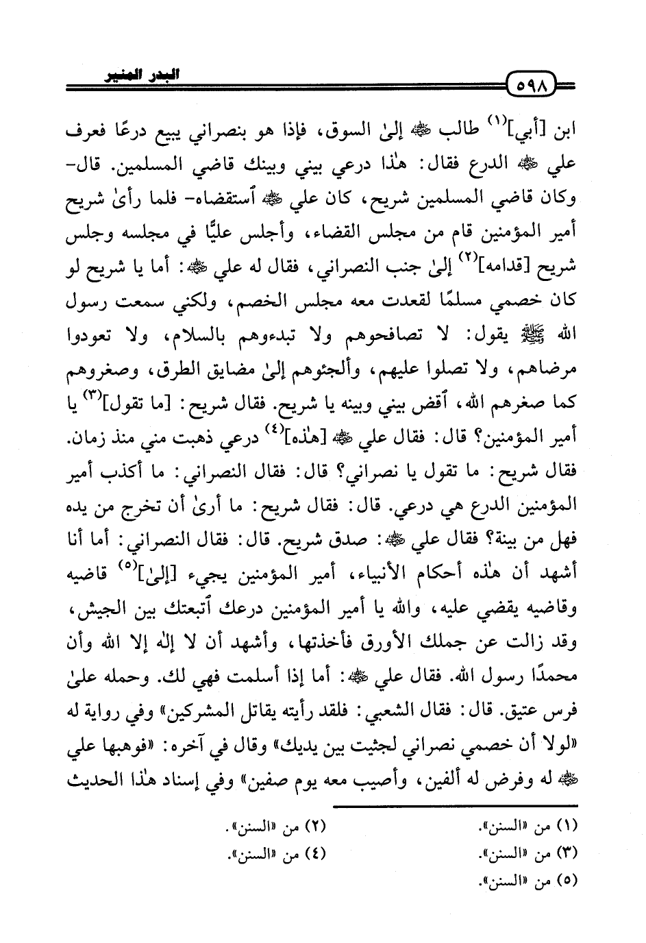 بن [أبي] طَالب رَضِيَ اللَّهُ عَنْه إِلَى السُّوق، فَإِذا هُوَ بنصراني يَبِيع درعًا فَعرف عَلّي رَضِيَ اللَّهُ عَنْه الدرْع فَقَالَ: هَذَا دِرْعِي بيني وَبَيْنك قَاضِي الْمُسلمين. قَالَ - وَكَانَ قَاضِي الْمُسلمين شُرَيْح، كَانَ عَلّي رَضِيَ اللَّهُ عَنْه استقضاه - فَلَمَّا رَأَى شُرَيْح أَمِير الْمُؤمنِينَ قَامَ من مجْلِس الْقَضَاء، وأجلس عليَّا فِي مَجْلِسه وَجلسَ شُرَيْح [قدامه] إِلَى جنب النَّصْرَانِي، فَقَالَ لَهُ عَلّي رَضِيَ اللَّهُ عَنْه: أما يَا شُرَيْح لَو كَانَ خصمي مُسلما لقعدت مَعَه مجْلِس الْخصم، وَلَكِنِّي سَمِعت رَسُول الله - صَلَّى الله عَلَيْهِ وَسلم - يَقُول: لَا تصافحوهم وَلَا تبدؤهم بِالسَّلَامِ، وَلَا تعودوا مرضاهم، وَلَا تصلوا عَلَيْهِم، وألجؤهم إِلَى مضايق الطّرق، وصغروهم كَمَا صغرهم الله اقْضِ بيني وَبَينه يَا شُرَيْح. فَقَالَ شُرَيْح: [تَقول] يَا أَمِير الْمُؤمنِينَ؟ قَالَ فَقَالَ عَلّي رَضِيَ اللَّهُ عَنْه [هَذِه] دِرْعِي ذهبت مني مُنْذُ زمَان. فَقَالَ شُرَيْح: مَا تَقول يَا نَصْرَانِيّ؟ قَالَ: فَقَالَ النَّصْرَانِي: مَا أكذب أَمِير الْمُؤمنِينَ الدرْع هِيَ دِرْعِي. قَالَ: فَقَالَ شُرَيْح: مَا أرَى أَن تخرج من يَده فَهَل من بَيِّنَة؟ فَقَالَ عَلّي رَضِيَ اللَّهُ عَنْه: صدق شُرَيْح. قَالَ: فَقَالَ النَّصْرَانِي: أما أَنا أشهد أَن هَذِه أَحْكَام الْأَنْبِيَاء، أَمِير الْمُؤمنِينَ يَجِيء [إِلَى] قاضيه وقاضيه يقْضِي عَلَيْهِ، وَالله يَا أَمِير الْمُؤمنِينَ درعك اتبعتك بَين الْجَيْش، وَقد زَالَت عَن جملك الأورق فأخذتها، وَأشْهد أَن لَا إِلَه إِلَّا الله وَأَن مُحَمَّدًا رَسُول الله. فَقَالَ عَلّي رَضِيَ اللَّهُ عَنْه: أما إِذا أسلمت فَهِيَ لَك. وَحمله عَلَى فرس عَتيق. قَالَ: فَقَالَ الشّعبِيّ: فَلَقَد رَأَيْته يُقَاتل الْمُشْركين» وَفِي رِوَايَة لَهُ «لَوْلَا أَن خصمي نَصْرَانِيّ لجثيت بَين يَديك» وَقَالَ فِي آخِره «فَوَهَبَهَا عَلّي رَضِيَ اللَّهُ عَنْه لَهُ وَفرض لَهُ أَلفَيْنِ، وَأُصِيب مَعَه يَوْم صفّين» وَفِي إِسْنَاد هَذَا الحَدِيث