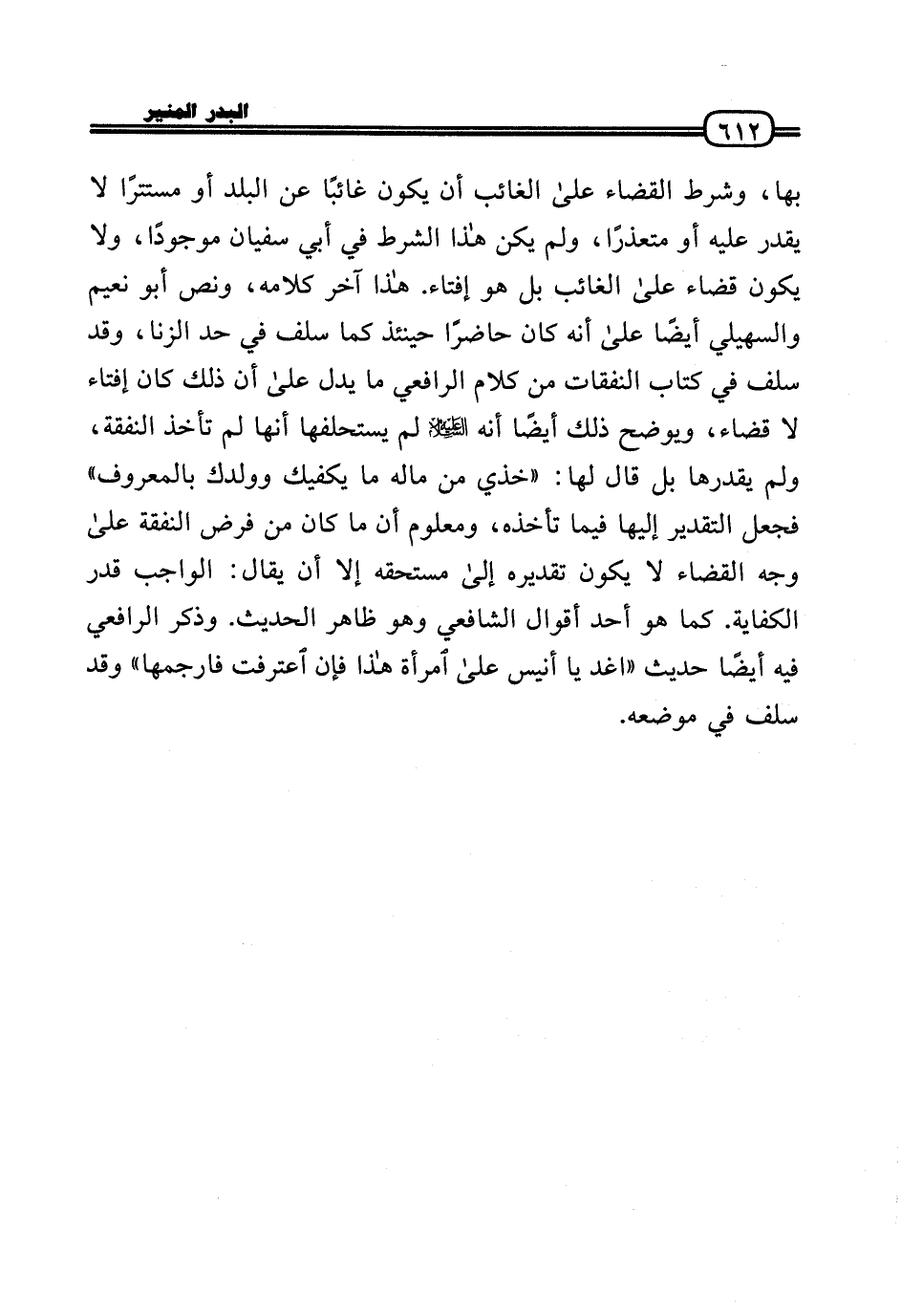 بهَا، وَشرط الْقَضَاء عَلَى الْغَائِب أَن يكون غَائِبا عَن الْبَلَد أَو مستترًا لَا يقدر عَلَيْهِ أَو متعذرًا، وَلم يكن هَذَا الشَّرْط فِي أبي سُفْيَان مَوْجُودا، وَلَا يكون قَضَاء عَلَى الْغَائِب بل هُوَ إِفْتَاء. هَذَا آخر كَلَامه، وَنَصّ أَبُو نعيم والسهيلي أَيْضا عَلَى أَنه كَانَ حَاضرا حِينَئِذٍ كَمَا سلف فِي حد الزِّنَا، وَقد سلف فِي كتاب النَّفَقَات من كَلَام الرَّافِعِيّ مَا يدل عَلَى أَن ذَلِك كَانَ إِفْتَاء لَا قَضَاء، ويوضح ذَلِك أَيْضا أَنه عَلَيْهِ السَّلَام لم يستحلفها أَنَّهَا لم تَأْخُذ النَّفَقَة، وَلم يقدرها بل قَالَ لَهَا: «خذي من مَاله مَا يَكْفِيك وولدك بِالْمَعْرُوفِ» فَجعل التَّقْدِير إِلَيْهَا فِيمَا تَأْخُذهُ، وَمَعْلُوم أَن مَا كَانَ من فرض النَّفَقَة عَلَى وَجه الْقَضَاء لَا يكون تَقْدِيره إِلَى مُسْتَحقّه إِلَّا أَن يُقَال: الْوَاجِب قدر الْكِفَايَة، كَمَا هُوَ أحد أَقْوَال الشَّافِعِي وَهُوَ ظَاهر الحَدِيث. وَذكر الرَّافِعِيّ فِيهِ أَيْضا حَدِيث «اغْدُ يَا أنيس عَلَى امْرَأَة هَذَا فَإِن اعْترفت فارجمها» وَقد سلف فِي مَوْضِعه.
