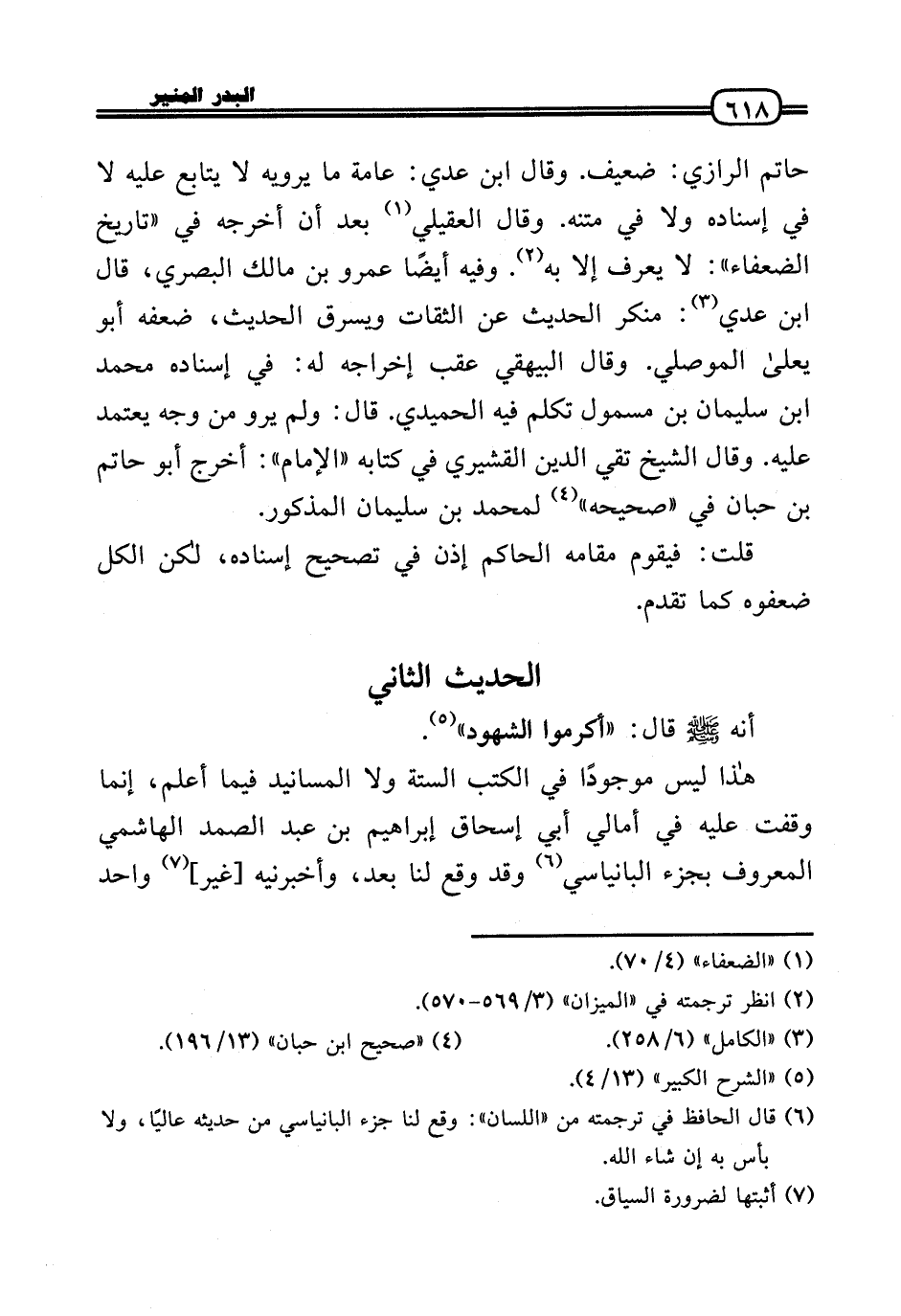حَاتِم الرَّازِيّ: ضَعِيف. وَقَالَ ابْن عدي: عَامَّة مَا يرويهِ لَا يُتَابع عَلَيْهِ لَا فِي إِسْنَاده وَلَا فِي مَتنه. وَقَالَ الْعقيلِيّ بعد أَن أخرجه فِي «تَارِيخ الضُّعَفَاء» : لَا يعرف إِلَّا بِهِ. وَفِيه أَيْضا عَمْرو بن مَالك الْبَصْرِيّ، قَالَ ابْن عدي: مُنكر الحَدِيث عَن الثِّقَات وَيسْرق الحَدِيث، ضعفه أَبُو يعْلى الْموصِلِي. وَقَالَ الْبَيْهَقِيّ عقب إِخْرَاجه لَهُ: فِي إِسْنَاده مُحَمَّد بن سُلَيْمَان بن مسمول تكلم فِيهِ الْحميدِي. قَالَ: وَلم يرو من وَجه يعْتَمد عَلَيْهِ. وَقَالَ الشَّيْخ تَقِيّ الدَّين الْقشيرِي فِي كِتَابه «الإِمَام» : أخرج أَبُو حَاتِم بن حبَان فِي «صحيحيه» لمُحَمد بن سُلَيْمَان الْمَذْكُور.