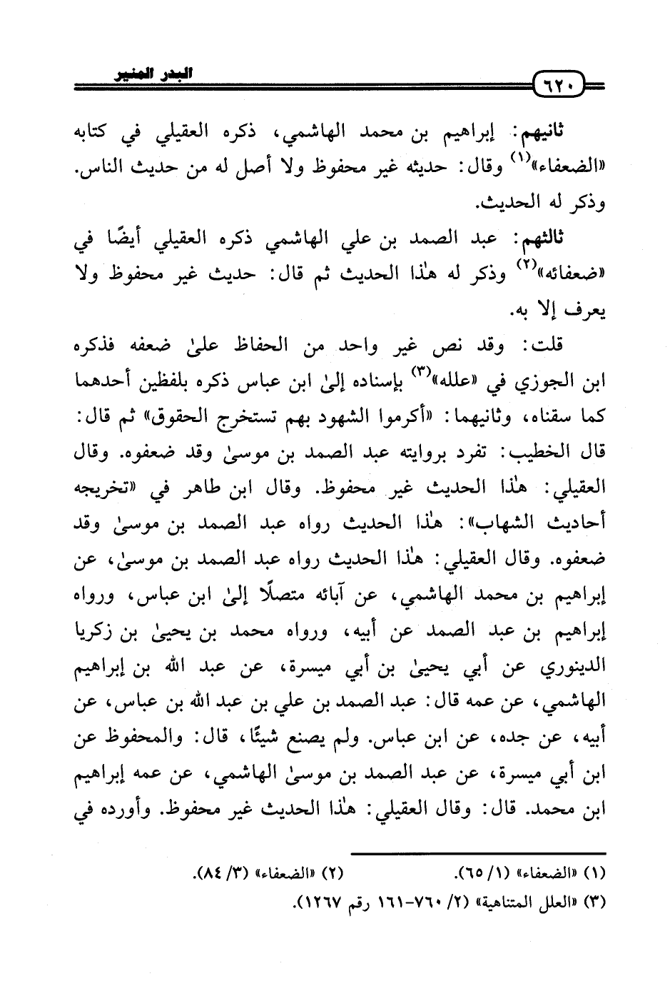 وَثَانِيهمَا: «أكْرمُوا الشُّهُود بهم تستخرج الْحُقُوق» ثمَّ قَالَ: قَالَ الْخَطِيب: تفرد بروايته عبد الصَّمد بن مُوسَى وَقد ضَعَّفُوهُ. وَقَالَ الْعقيلِيّ: هَذَا الحَدِيث غير مَحْفُوظ. وَقَالَ ابْن طَاهِر فِي «تَخْرِيجه أَحَادِيث الشهَاب» : هَذَا الحَدِيث رَوَاهُ عبد الصَّمد بن مُوسَى وَقد ضَعَّفُوهُ. وَقَالَ الْعقيلِيّ: هَذَا الحَدِيث رَوَاهُ عبد الصَّمد بن مُوسَى، عَن إِبْرَاهِيم بن مُحَمَّد الْهَاشِمِي، عَن آبَائِهِ مُتَّصِلا إِلَى ابْن عَبَّاس، وَرَوَاهُ إِبْرَاهِيم بن عبد الصَّمد عَن أَبِيه، وَرَوَاهُ مُحَمَّد بن يَحْيَى بن زَكَرِيَّا الدينَوَرِي عَن أبي يَحْيَى بن أبي ميسرَة، عَن عبد الله بن إِبْرَاهِيم الْهَاشِمِي، عَن عَمه قَالَ: عبد الصَّمد بن عَلّي بن عبد الله بن عَبَّاس، عَن أَبِيه، عَن جده، عَن ابْن عَبَّاس، وَلم يصنع شَيْئا. قَالَ: وَالْمَحْفُوظ عَن ابْن أبي ميسرَة، عَن عبد الصَّمد بن مُوسَى الْهَاشِمِي، عَن عَمه إِبْرَاهِيم بن مُحَمَّد. قَالَ: وَقَالَ الْعقيلِيّ: هَذَا الحَدِيث غير مَحْفُوظ. وَأوردهُ فِي