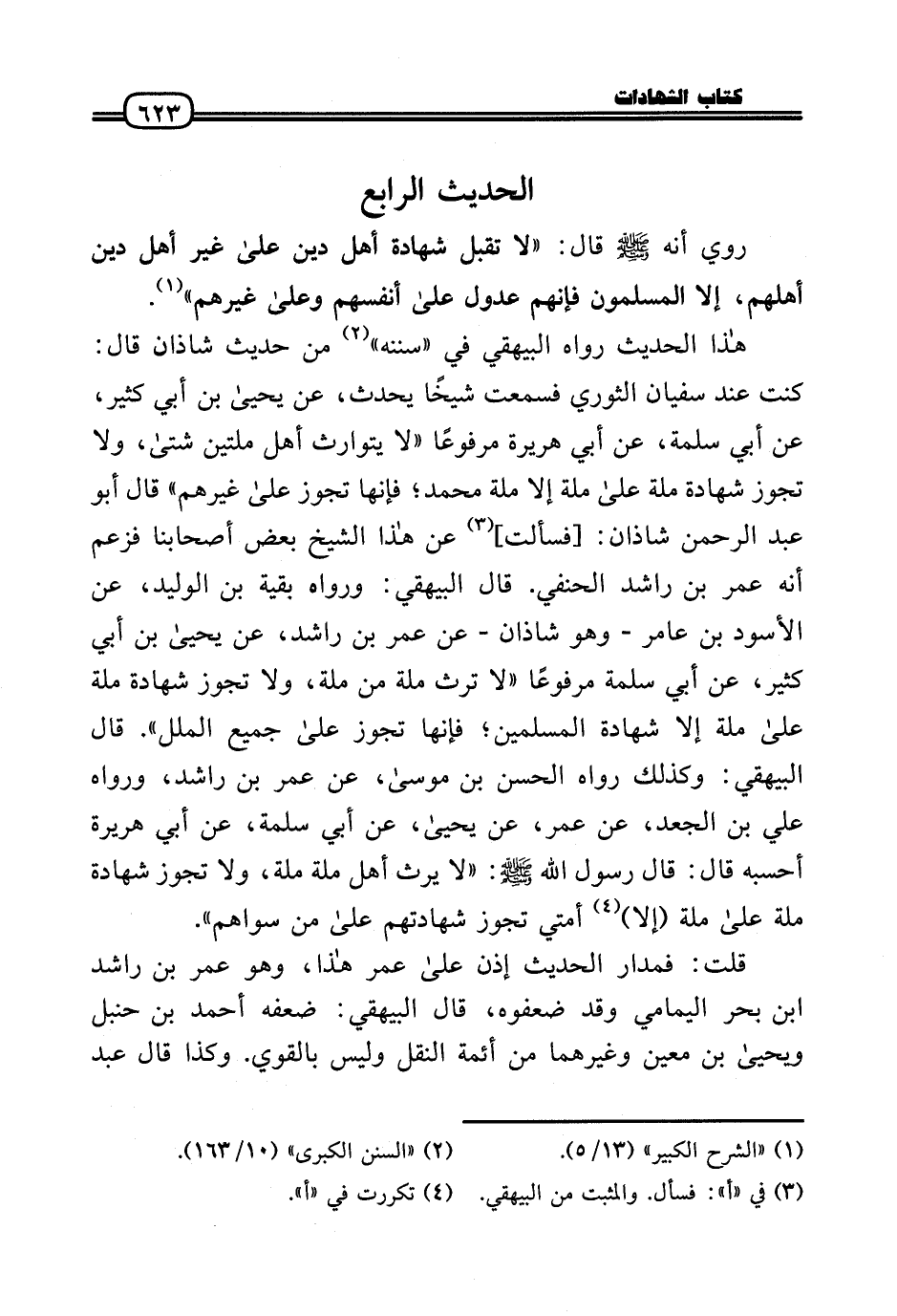 هَذَا الحَدِيث رَوَاهُ الْبَيْهَقِيّ فِي «سنَنه» من حَدِيث شَاذان قَالَ: كنت عِنْد سُفْيَان الثَّوْريّ فَسمِعت شَيخا يحدث، عَن يَحْيَى بن أبي كثير، عَن أبي سَلمَة، عَن أبي هُرَيْرَة مَرْفُوعا «لَا يتوارث أهل ملتين شَتَّى، وَلَا تجوز شَهَادَة مِلَّة عَلَى مِلَّة إِلَّا مِلَّة مُحَمَّد؛ فَإِنَّهَا تجوز عَلَى غَيرهم» قَالَ أَبُو عبد الرَّحْمَن شَاذان [فَسَأَلت] عَن هَذَا الشَّيْخ بعض أَصْحَابنَا فَزعم أَنه عمر بن رَاشد الْحَنَفِيّ. قَالَ الْبَيْهَقِيّ وَرَوَاهُ بَقِيَّة بن الْوَلِيد، عَن الْأسود بن عَامر - وَهُوَ شَاذان - عَن عمر بن رَاشد، عَن يَحْيَى بن أبي كثير عَن، أبي سَلمَة مَرْفُوعا «لَا تَرث مِلَّة من مِلَّة، وَلَا تجوز شَهَادَة مِلَّة عَلَى مِلَّة إِلَّا شَهَادَة الْمُسلمين؛ فَإِنَّهَا تجوز عَلَى جَمِيع الْملَل» . قَالَ الْبَيْهَقِيّ: وَكَذَلِكَ رَوَاهُ الْحسن بن مُوسَى، عَن عمر بن رَاشد، وَرَوَاهُ عَلّي بن الْجَعْد، عَن عمر، عَن يَحْيَى عَن أبي سَلمَة، عَن أبي هُرَيْرَة أَحْسبهُ قَالَ: قَالَ رَسُول الله - صَلَّى الله عَلَيْهِ وَسلم -: «لَا يَرث أهل مِلَّة مِلَّة، وَلَا تجوز شَهَادَة مِلَّة عَلَى مِلَّة (إِلَّا) أمتِي تجوز شَهَادَتهم عَلَى من سواهُم» .