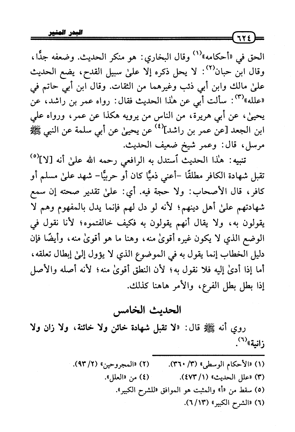 الْحق فِي «أَحْكَامه» وَقَالَ البُخَارِيّ: هُوَ مُنكر الحَدِيث. وَضَعفه جدًّا، وَقَالَ ابْن حبَان: لَا يحل ذكره إِلَّا عَلَى سَبِيل الْقدح، يضع الحَدِيث عَلَى مَالك وَابْن أبي ذِئْب وَغَيرهمَا من الثِّقَات. وَقَالَ ابْن أبي حَاتِم فِي «علله» : سَأَلت أبي عَن هَذَا الحَدِيث فَقَالَ: رَوَاهُ عمر بن رَاشد، عَن يَحْيَى، عَن أبي هُرَيْرَة، من النَّاس من يرويهِ هَكَذَا عَن عمر، وَرَوَاهُ عَلّي بن الْجَعْد [عَن عمر بن رَاشد] عَن يَحْيَى عَن أبي سَلمَة عَن النَّبِي - صَلَّى الله عَلَيْهِ وَسلم - مُرْسل، قَالَ: وَعمر شيخ ضَعِيف الحَدِيث.