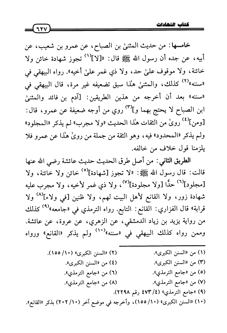 خَامِسهَا: من حَدِيث الْمثنى بن الصَّباح، عَن عَمْرو بن شُعَيْب، عَن أَبِيه، عَن جده أَن رَسُول الله - صَلَّى الله عَلَيْهِ وَسلم - قَالَ: « [لَا] تجوز شَهَادَة خائن وَلَا خَائِنَة، وَلَا مَوْقُوف عَلَى حد، وَلَا ذِي غمر عَلَى أَخِيه» . رَوَاهُ الْبَيْهَقِيّ فِي «سنَنه» كَذَلِك، والمثنى هَذَا سبق تَضْعِيفه غير مرّة، قَالَ الْبَيْهَقِيّ فِي «سنَنه» بعد أَن أخرجه من هذَيْن الطَّرِيقَيْنِ: [آدم بن فائد والمثنى بن الصَّباح لَا يحْتَج بهما و] رُوِيَ من أوجه ضَعِيفَة عَن عَمْرو، قَالَ: [وَمن] رَوَى من الثِّقَات هَذَا الحَدِيث «وَلَا مجرب» لم يذكر «المجلود» وَلم يذكر «الْمَحْدُود» فِيهِ، وَهُوَ الثِّقَة من جملَة من رَوَى هَذَا عَن عَمْرو فَلَا يلْزمنَا قَول خلاف من خَالفه.