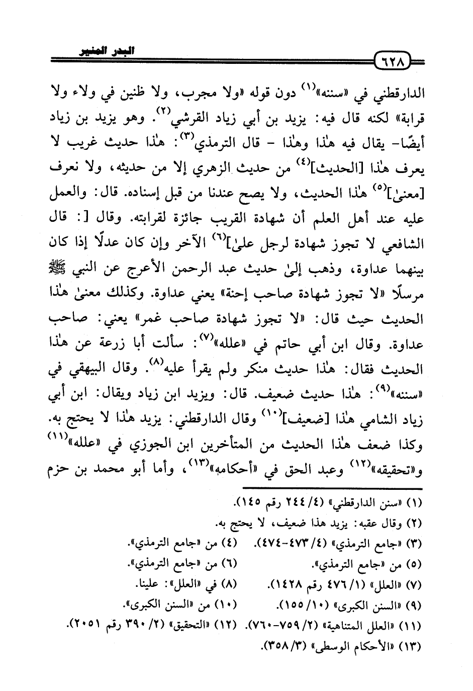 الدَّارَقُطْنِيّ فِي «سنَنه» دون قَوْله «وَلَا مجرب، وَلَا ظنين فِي وَلَاء وَلَا قرَابَة» لكنه قَالَ فِيهِ: يزِيد بن أبي زِيَاد الْقرشِي. وَهُوَ يزِيد بن زِيَاد أَيْضا - يُقَال فِيهِ هَذَا وَهَذَا - قَالَ التِّرْمِذِيّ: هَذَا حَدِيث غَرِيب لَا يعرف هَذَا [الحَدِيث] من حَدِيث الزُّهْرِيّ إِلَّا من حَدِيثه، وَلَا نَعْرِف [مَعْنَى] هَذَا الحَدِيث، وَلَا يَصح عندنَا من قبل إِسْنَاده. قَالَ: وَالْعَمَل عَلَيْهِ عِنْد أهل الْعلم أَن شَهَادَة الْقَرِيب جَائِزَة لِقَرَابَتِهِ. وَقَالَ [: قَالَ الشَّافِعِي لَا تجوز شَهَادَة لرجل عَلَى] الآخر: وَإِن كَانَ عدلا إِذا كَانَ بَينهمَا عَدَاوَة، وَذهب إِلَيّ حَدِيث عبد الرَّحْمَن الْأَعْرَج عَن النَّبِي - صَلَّى الله عَلَيْهِ وَسلم - مُرْسلا «لَا تجوز شَهَادَة صَاحب إحْنَة» يَعْنِي عَدَاوَة. وَكَذَلِكَ مَعْنَى هَذَا الحَدِيث حَيْثُ قَالَ: «لَا تجوز شَهَادَة صَاحب غمر» يَعْنِي صَاحب عَدَاوَة. وَقَالَ ابْن أبي حَاتِم فِي «علله» : سَأَلت أَبَا زرْعَة عَن هَذَا الحَدِيث فَقَالَ: هَذَا حَدِيث مُنكر وَلم يقْرَأ عَلَيْهِ. وَقَالَ الْبَيْهَقِيّ فِي «سنَنه» : هَذَا حَدِيث ضَعِيف. قَالَ: وَيزِيد ابْن زِيَاد وَيُقَال: ابْن أبي زِيَاد الشَّامي هَذَا وَقَالَ الدَّارَقُطْنِيّ: يزِيد هَذَا [ضَعِيف] لَا يحْتَج بِهِ. وَكَذَا ضعف هَذَا الحَدِيث من الْمُتَأَخِّرين ابْن الْجَوْزِيّ فِي «علله» و «تَحْقِيقه» وَعبد الْحق فِي «أَحْكَامه» ، وَأما أَبُو مُحَمَّد بن حزم