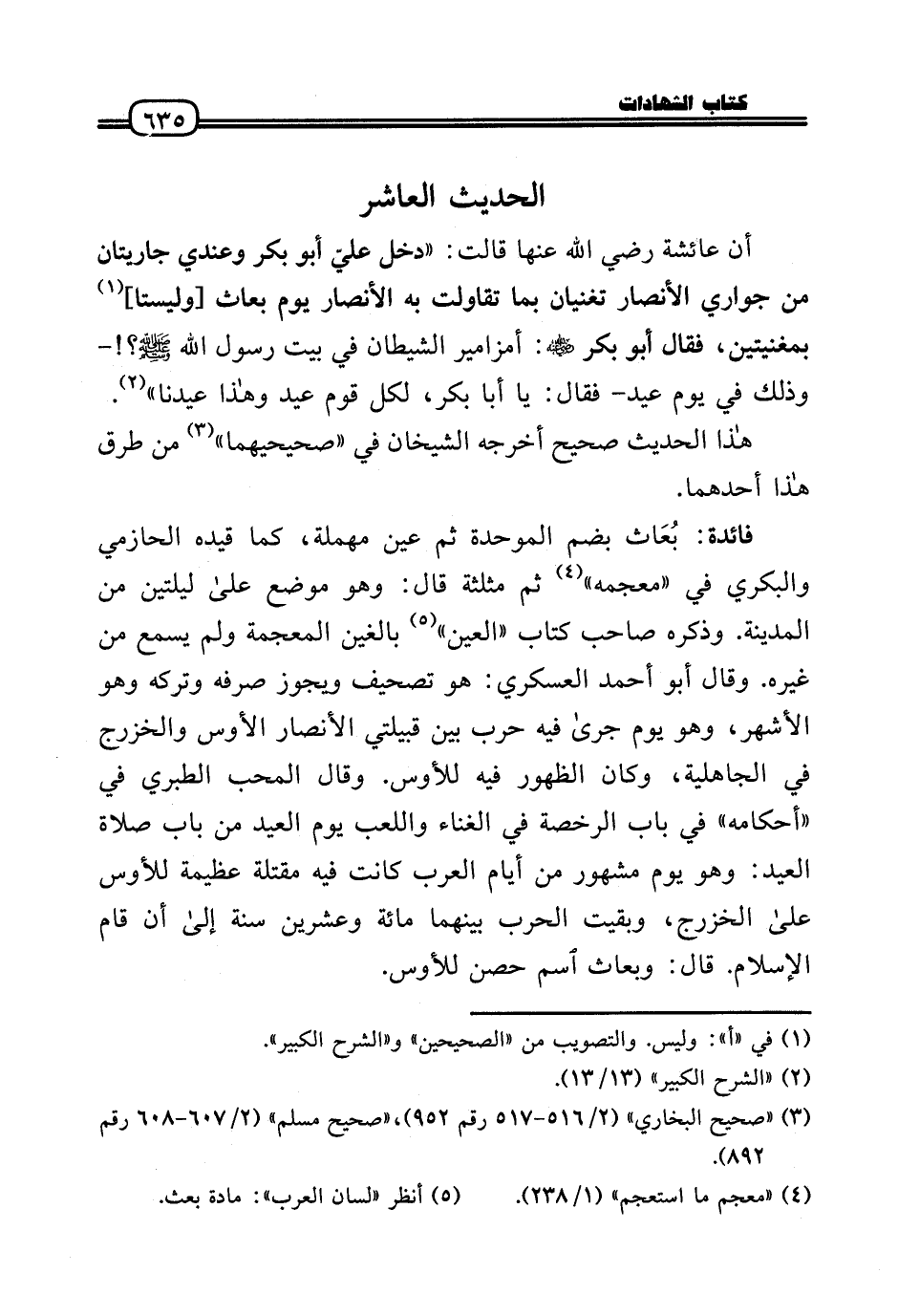 أَن عَائِشَة رَضِيَ اللَّهُ عَنْها قَالَت: «دخل عليّ أَبُو بكر وَعِنْدِي جاريتان من جواري الْأَنْصَار تُغنيَانِ بِمَا تقاولت بِهِ الْأَنْصَار يَوْم بُعَاث [وليستا] بمغنيتين، فَقَالَ أَبُو بكر رَضِيَ اللَّهُ عَنْه: أمزامير الشَّيْطَان فِي بَيت رَسُول الله - صَلَّى الله عَلَيْهِ وَسلم -؟ ! - وَذَلِكَ فِي يَوْم عيد - فَقَالَ: يَا أَبَا بكر، لكل قوم عيد وَهَذَا عيدنا» .