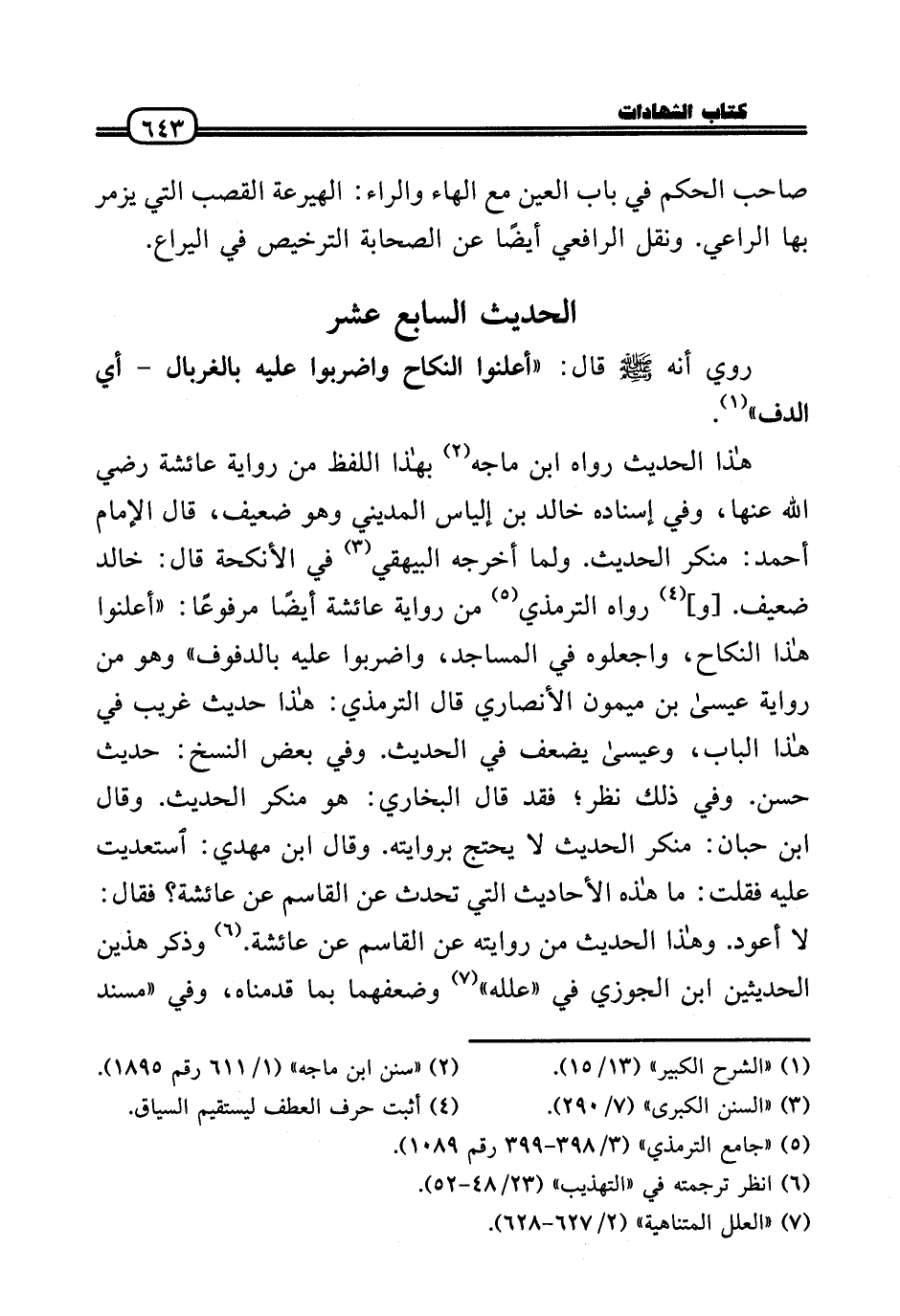 هَذَا الحَدِيث رَوَاهُ ابْن مَاجَه بِهَذَا اللَّفْظ من رِوَايَة عَائِشَة رَضِيَ اللَّهُ عَنْها، وَفِي إِسْنَاده خَالِد بن إلْيَاس الْمَدِينِيّ وَهُوَ ضَعِيف، قَالَ الإِمَام أَحْمد: مُنكر الحَدِيث. وَلما أخرجه الْبَيْهَقِيّ فِي الْأَنْكِحَة قَالَ: خَالِد ضَعِيف. [و] رَوَاهُ التِّرْمِذِيّ من رِوَايَة عَائِشَة أَيْضا مَرْفُوعا: «أعْلنُوا هَذَا النِّكَاح، واجعلوه فِي الْمَسَاجِد، واضربوا عَلَيْهِ بِالدُّفُوفِ» وَهُوَ من رِوَايَة عِيسَى بن مَيْمُون الْأنْصَارِيّ قَالَ التِّرْمِذِيّ: هَذَا حَدِيث غَرِيب فِي هَذَا الْبَاب، وَعِيسَى يضعف فِي الحَدِيث. وَفِي بعض النّسخ: حَدِيث حسن. وَفِي ذَلِك نظر؛ فقد قَالَ البُخَارِيّ: هُوَ مُنكر الحَدِيث. وَقَالَ ابْن حبَان: مُنكر الحَدِيث لَا يحْتَج بروايته. وَقَالَ ابْن مهْدي: استعديت عَلَيْهِ فَقلت: مَا هَذِه الْأَحَادِيث الَّتِي تحدث عَن الْقَاسِم عَن عَائِشَة؟ فَقَالَ: لَا أَعُود. وَهَذَا الحَدِيث من رِوَايَته عَن الْقَاسِم عَن عَائِشَة. وَذكر هذَيْن الْحَدِيثين ابْن الْجَوْزِيّ فِي «علله» وَضعفهمَا بِمَا قدمْنَاهُ، وَفِي «مُسْند