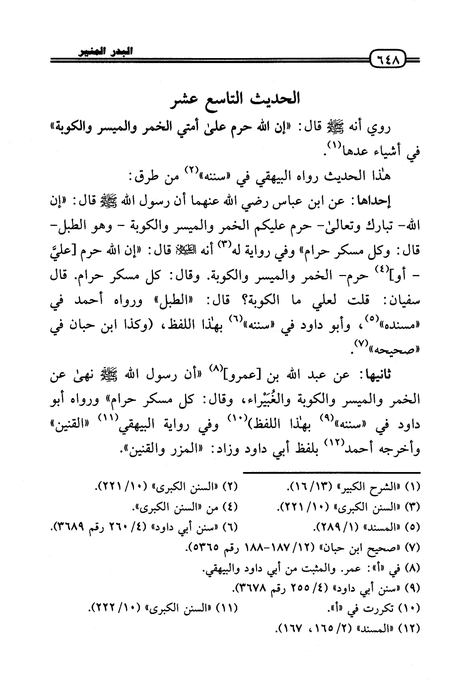 ثَانِيهَا: عَن عبد الله بن [عمر و] «أَن رَسُول الله - صَلَّى الله عَلَيْهِ وَسلم - نهَى عَن الْخمر وَالْميسر والكوبة والغُبَيْراء، وَقَالَ: كل مُسكر حرَام» وَرَوَاهُ أَبُو دَاوُد فِي «سنَنه» بِهَذَا اللَّفْظ) وَفِي رِوَايَة الْبَيْهَقِيّ «القنين» وَأخرجه أَحْمد بِلَفْظ أبي دَاوُد وَزَاد: «المزر والقنين» .