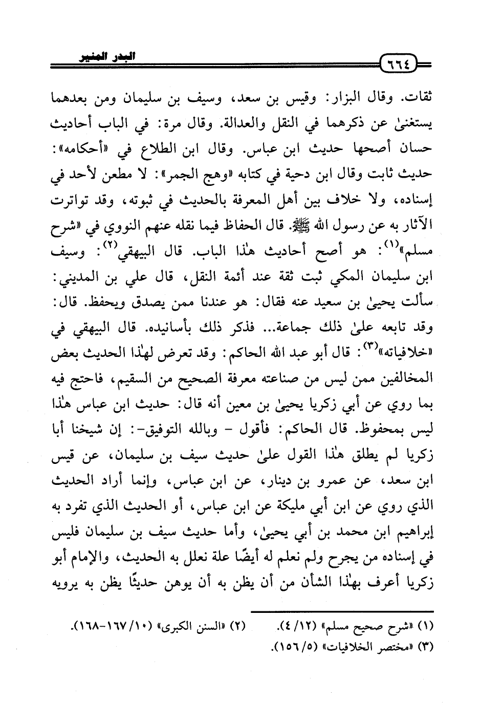 ثِقَات. وَقَالَ الْبَزَّار: وَقيس بن سعد، وَسيف بن سُلَيْمَان وَمن بعدهمَا يُسْتَغْنَى عَن ذكرهمَا فِي النَّقْل وَالْعَدَالَة. وَقَالَ مرّة: فِي الْبَاب: أَحَادِيث حسان أَصَحهَا حَدِيث ابْن عَبَّاس. وَقَالَ ابْن الطلاع فِي «أَحْكَامه» : حَدِيث ثَابت وَقَالَ ابْن دحْيَة فِي كِتَابه و «هج الْجَمْر» : لَا مطْعن لأحد فِي إِسْنَاده، وَلَا خلاف بَين أهل الْمعرفَة بِالْحَدِيثِ فِي ثُبُوته، وَقد تَوَاتَرَتْ الْآثَار بِهِ عَن رَسُول الله - صَلَّى الله عَلَيْهِ وَسلم -. قَالَ الْحفاظ فِيمَا نَقله عَنْهُم النَّوَوِيّ فِي «شرح مُسلم» : هُوَ أصح أَحَادِيث هَذَا الْبَاب. قَالَ الْبَيْهَقِيّ: وَسيف بن سُلَيْمَان الْمَكِّيّ ثَبت ثِقَة عِنْد أَئِمَّة النَّقْل، قَالَ عَلّي بن الْمَدِينِيّ: سَأَلت يَحْيَى بن سعيد عَنهُ فَقَالَ: هُوَ عندنَا مِمَّن يصدق ويحفظ. قَالَ: وَقد تَابعه عَلَى ذَلِك جمَاعَة ... فَذكر ذَلِك بأسانيده. قَالَ الْبَيْهَقِيّ فِي «خلافياته» : قَالَ أَبُو عبد الله الْحَاكِم: وَقد تعرض لهَذَا الحَدِيث بعض الْمُخَالفين مِمَّن لَيْسَ من صناعته معرفَة الصَّحِيح من السقيم، فاحتج فِيهِ بِمَا رُوِيَ عَن أبي زَكَرِيَّا يَحْيَى بن معِين أَنه قَالَ: حَدِيث ابْن عَبَّاس هَذَا لَيْسَ بِمَحْفُوظ. قَالَ الْحَاكِم: فَأَقُول - وَبِاللَّهِ التَّوْفِيق -: إِن شَيخنَا أَبَا زَكَرِيَّا لم يُطلق هَذَا القَوْل عَلَى حَدِيث سيف بن سُلَيْمَان، عَن قيس بن سعد، عَن عَمْرو بن دِينَار، عَن ابْن عَبَّاس، وَإِنَّمَا أَرَادَ الحَدِيث الَّذِي رُوِيَ عَن ابْن أبي مليكَة عَن ابْن عَبَّاس، أَو الحَدِيث الَّذِي تفرد بِهِ إِبْرَاهِيم بن مُحَمَّد بن أبي يَحْيَى، وَأما حَدِيث سيف بن سُلَيْمَان فَلَيْسَ فِي إِسْنَاده من يجرح وَلم نعلم لَهُ أَيْضا عِلّة نعلل بِهِ الحَدِيث، وَالْإِمَام أَبُو زَكَرِيَّا أعرف بِهَذَا الشَّأْن من أَن يظنّ بِهِ أَن يوهن حَدِيثا يظنّ بِهِ يرويهِ