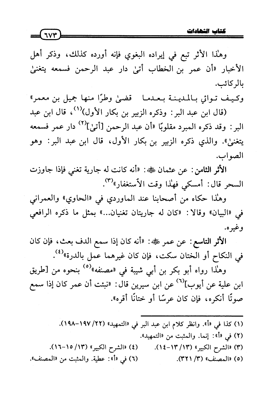 (قَالَ ابْن عبد الْبر: وَذكره الزبير بن بكار الأول) ، قَالَ ابْن عبد الْبر: وَقد ذكره الْمبرد «مقلوبًا أَن عبد الرَّحْمَن [أَتَى] دَار عمر فَسَمعهُ يتَغَنَّى» . وَالَّذِي ذكره الزبير بن بكار الأول، قَالَ ابْن عبد الْبر: وَهُوَ الصَّوَاب.